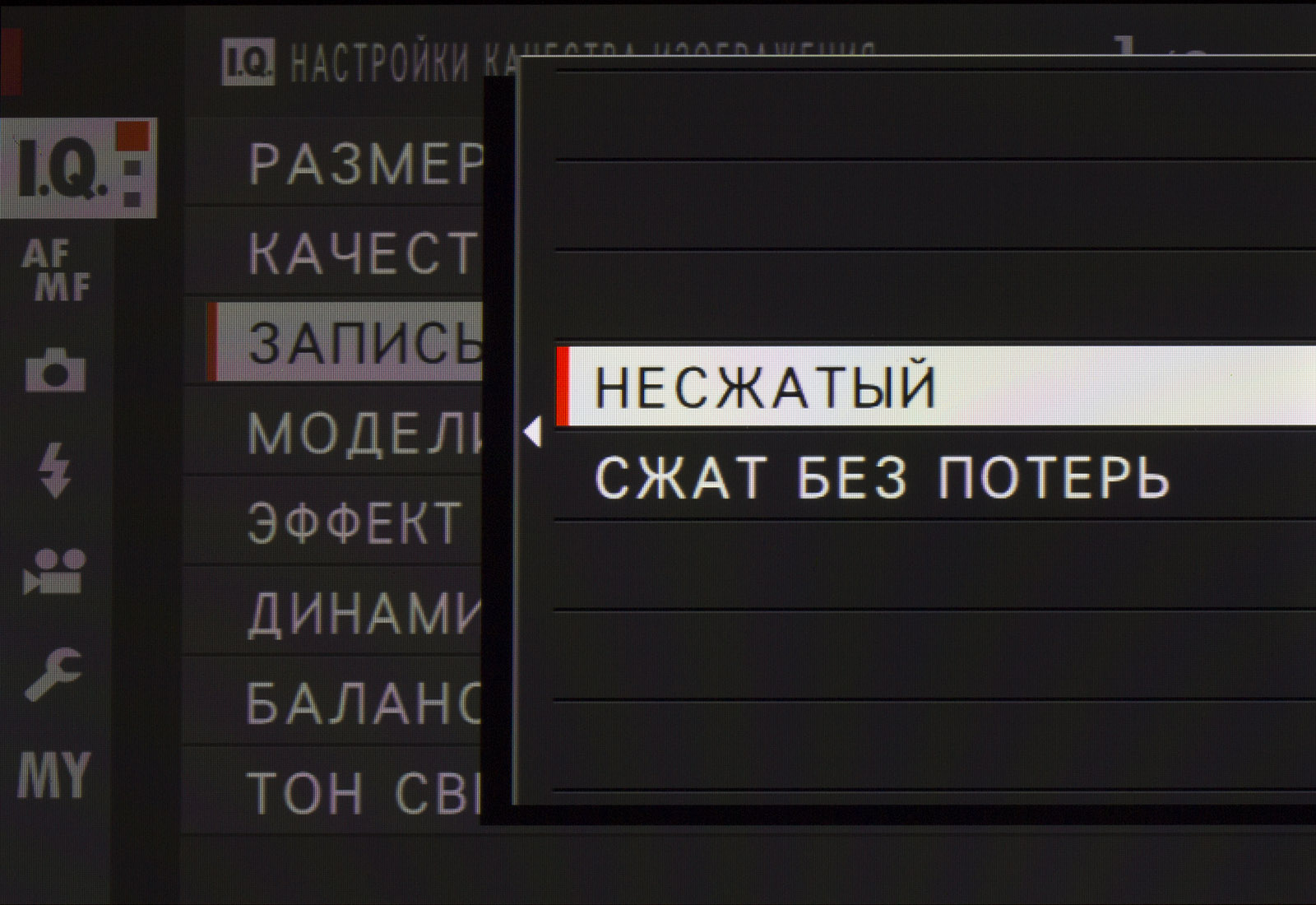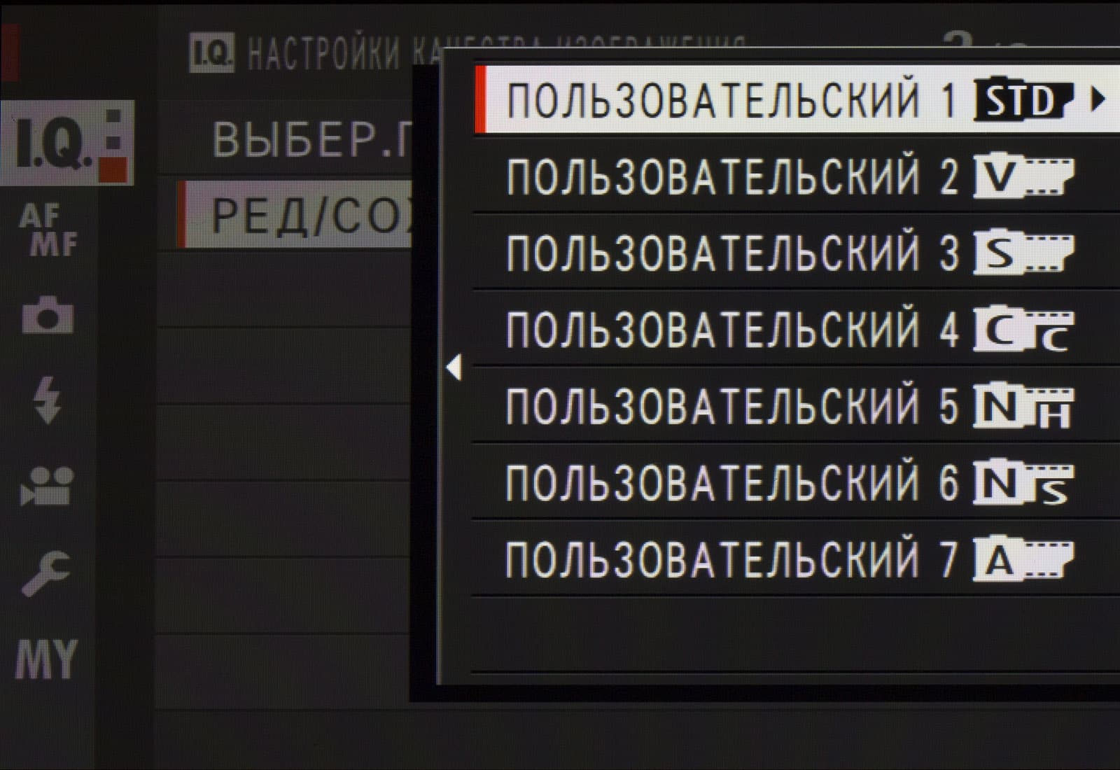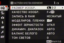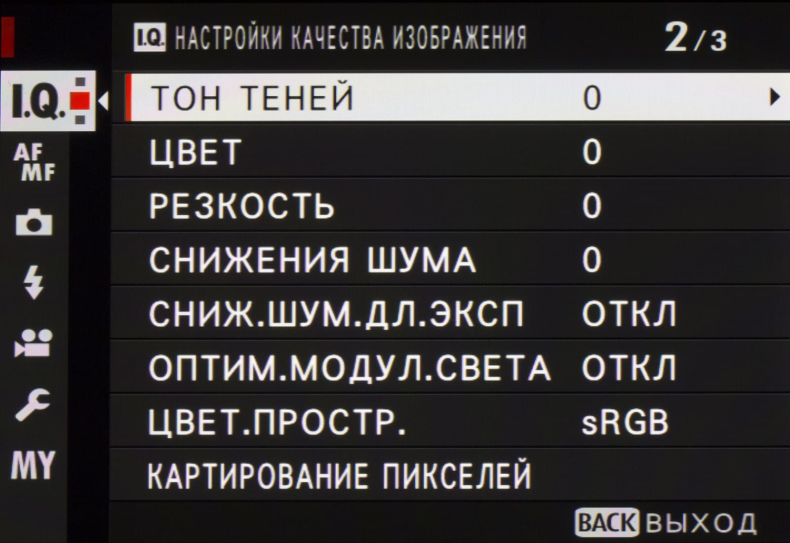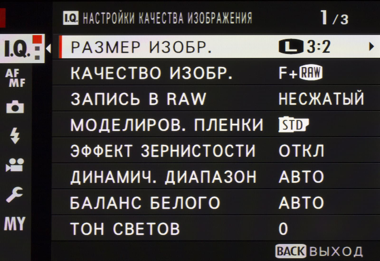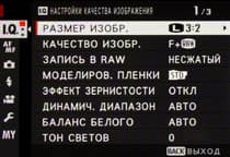 - I.Q. — Image Quality, «Качество изображения». Это настройки формата файлов, вида RAW (со сжатием или без сжатия), моделирования «пленки», эффекта зернистости, установки динамического диапазона и др.