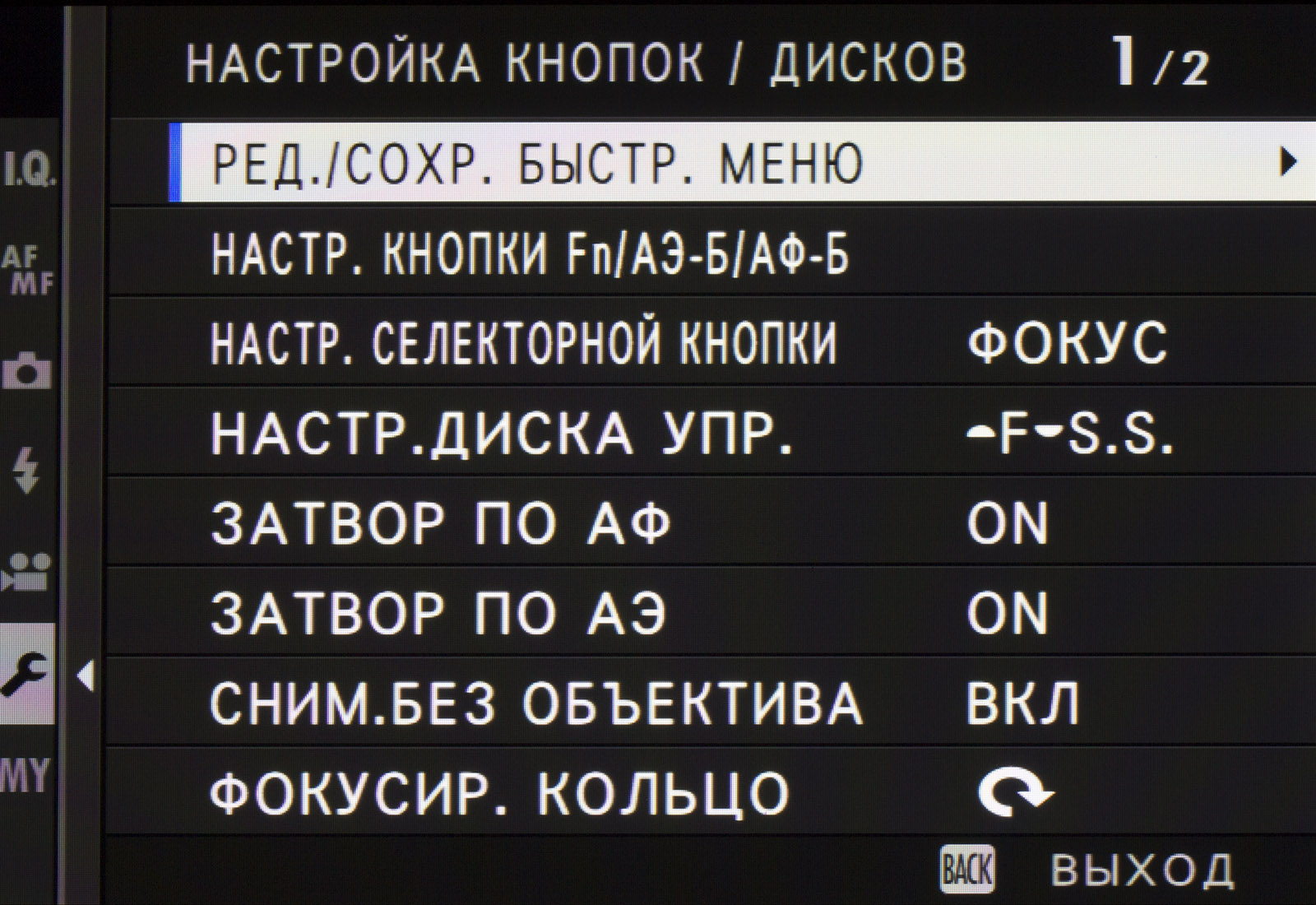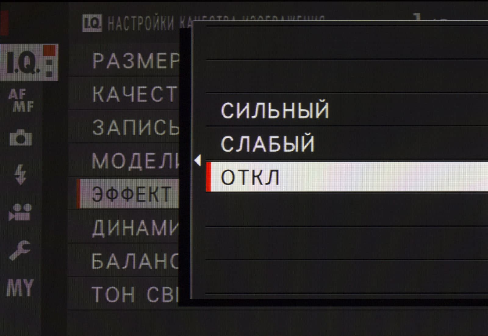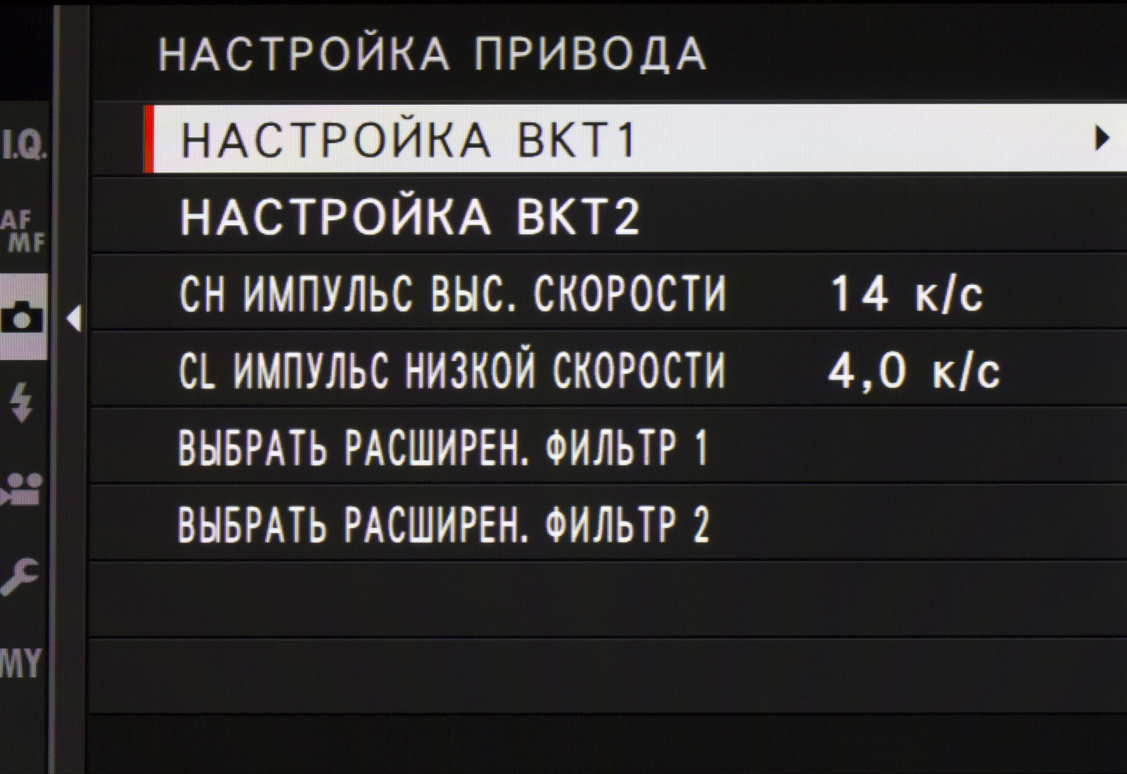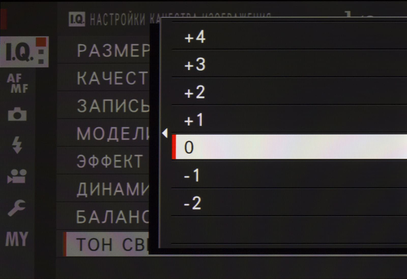 - I.Q. — Image Quality, «Качество изображения». Это настройки формата файлов, вида RAW (со сжатием или без сжатия), моделирования «пленки», эффекта зернистости, установки динамического диапазона и др.