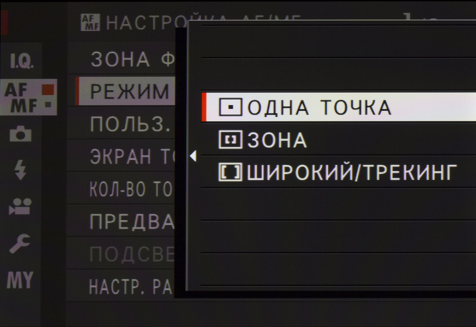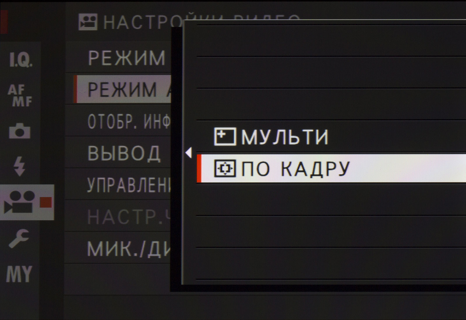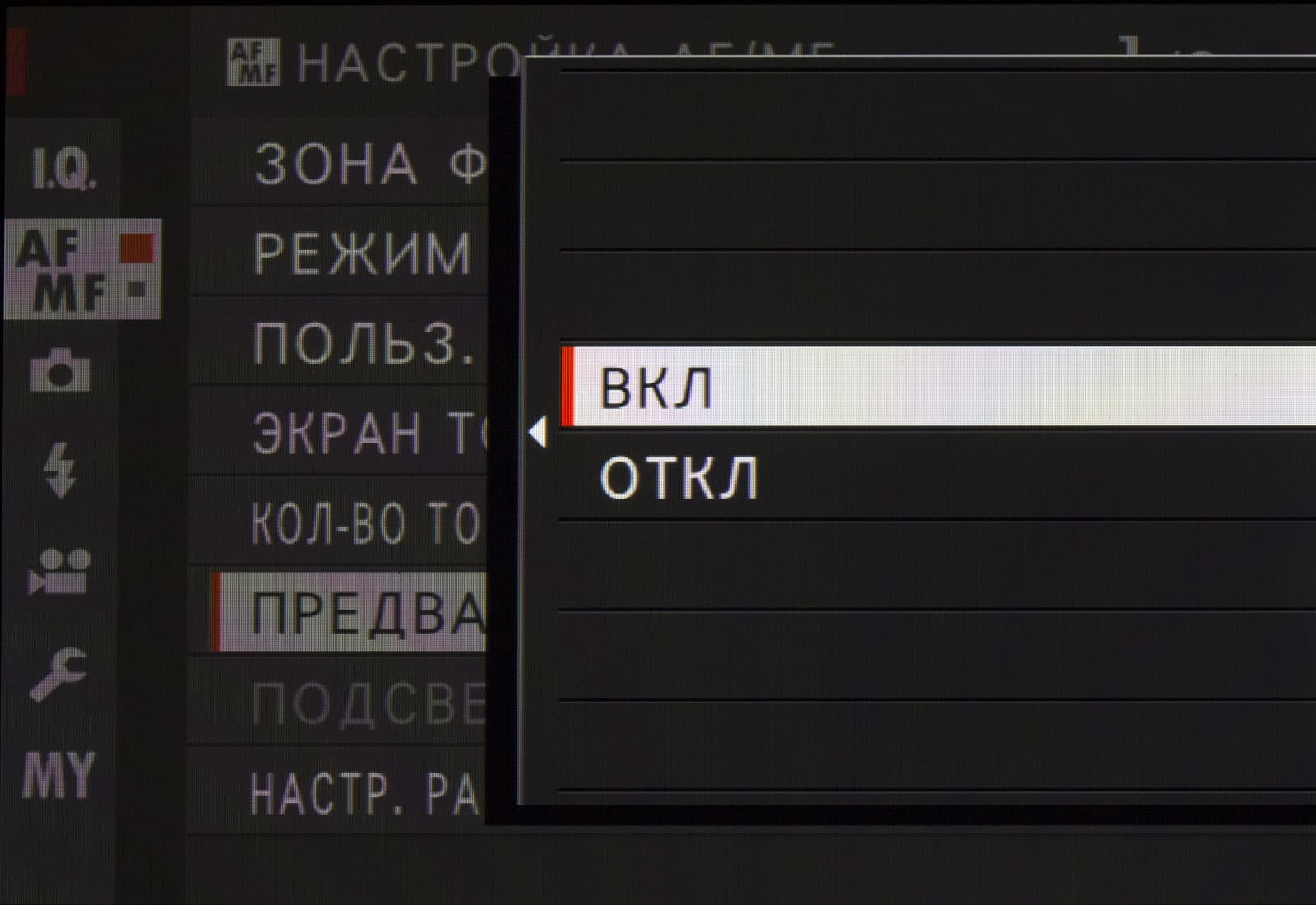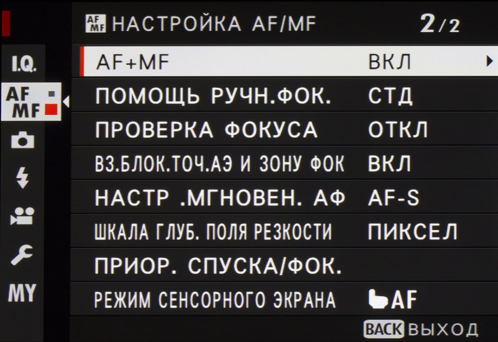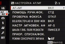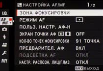 - AF/MF — настройки автоматической и ручной фокусировки.