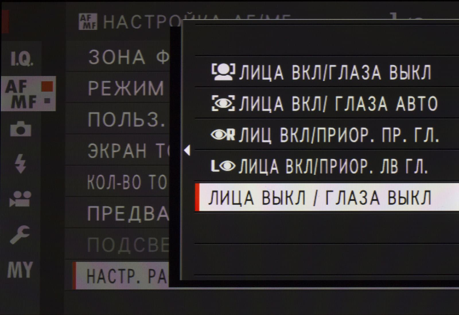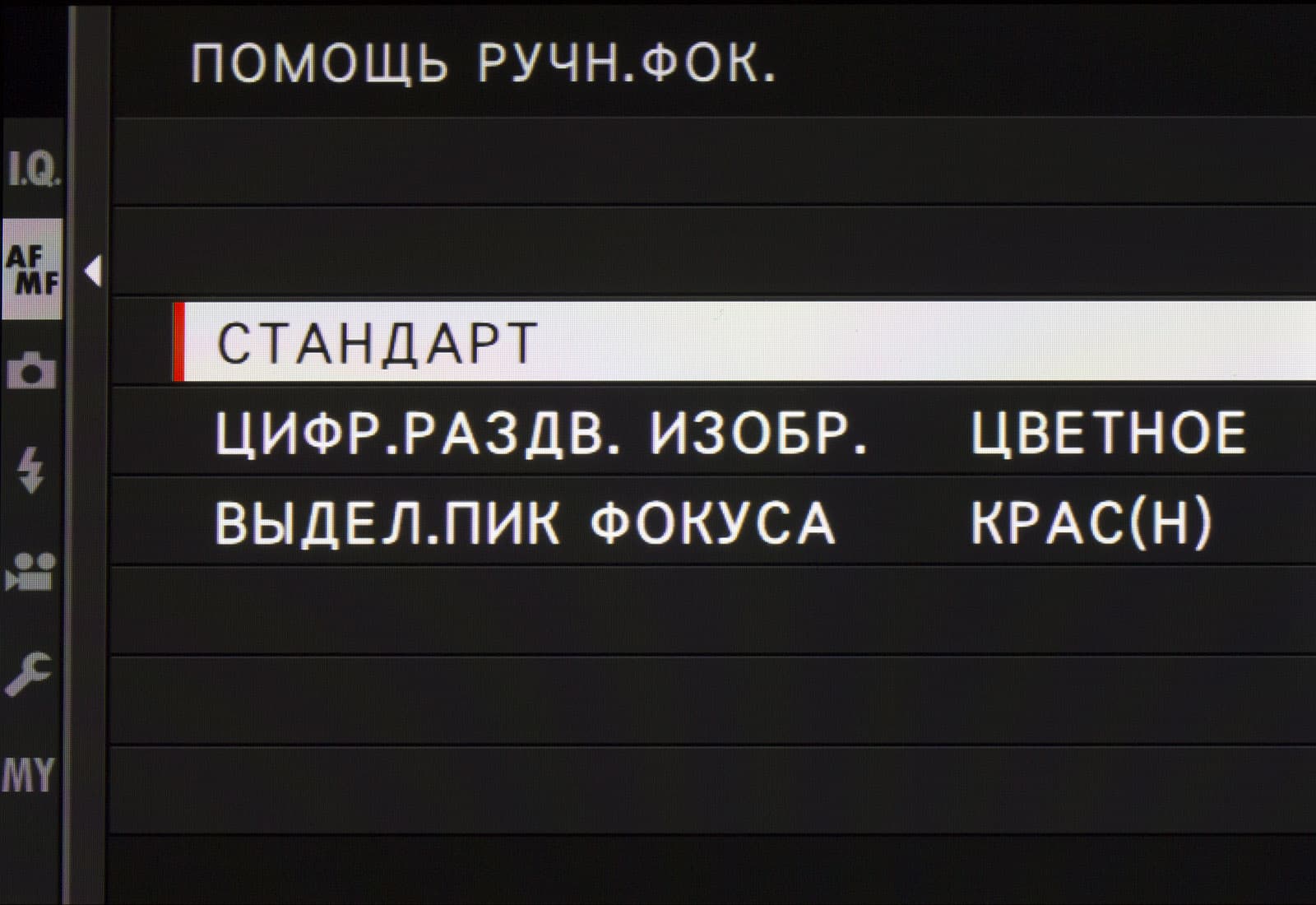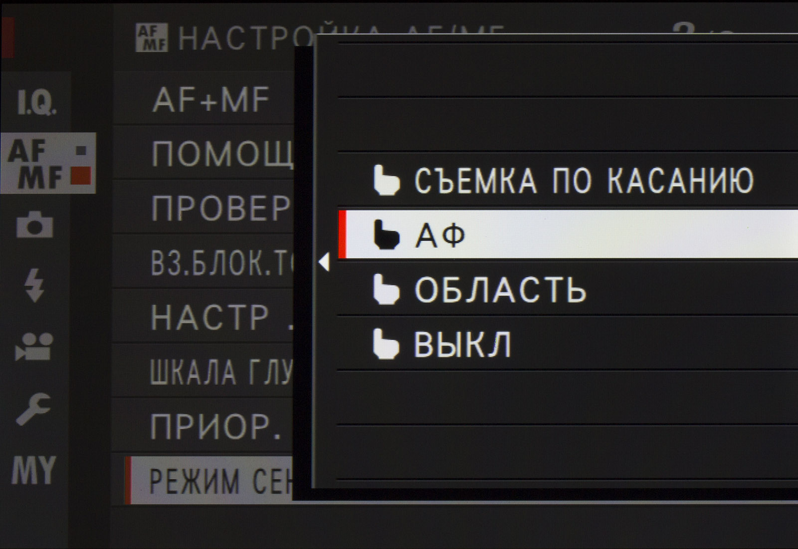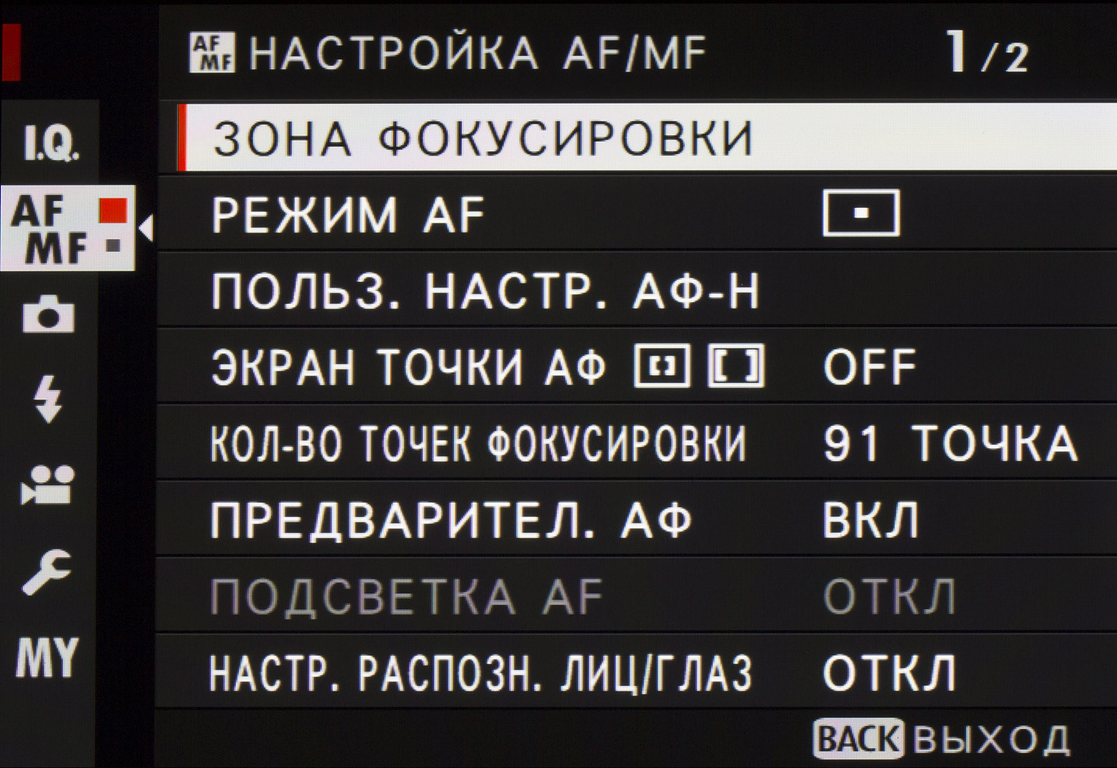 - AF/MF — настройки автоматической и ручной фокусировки.