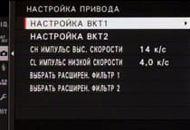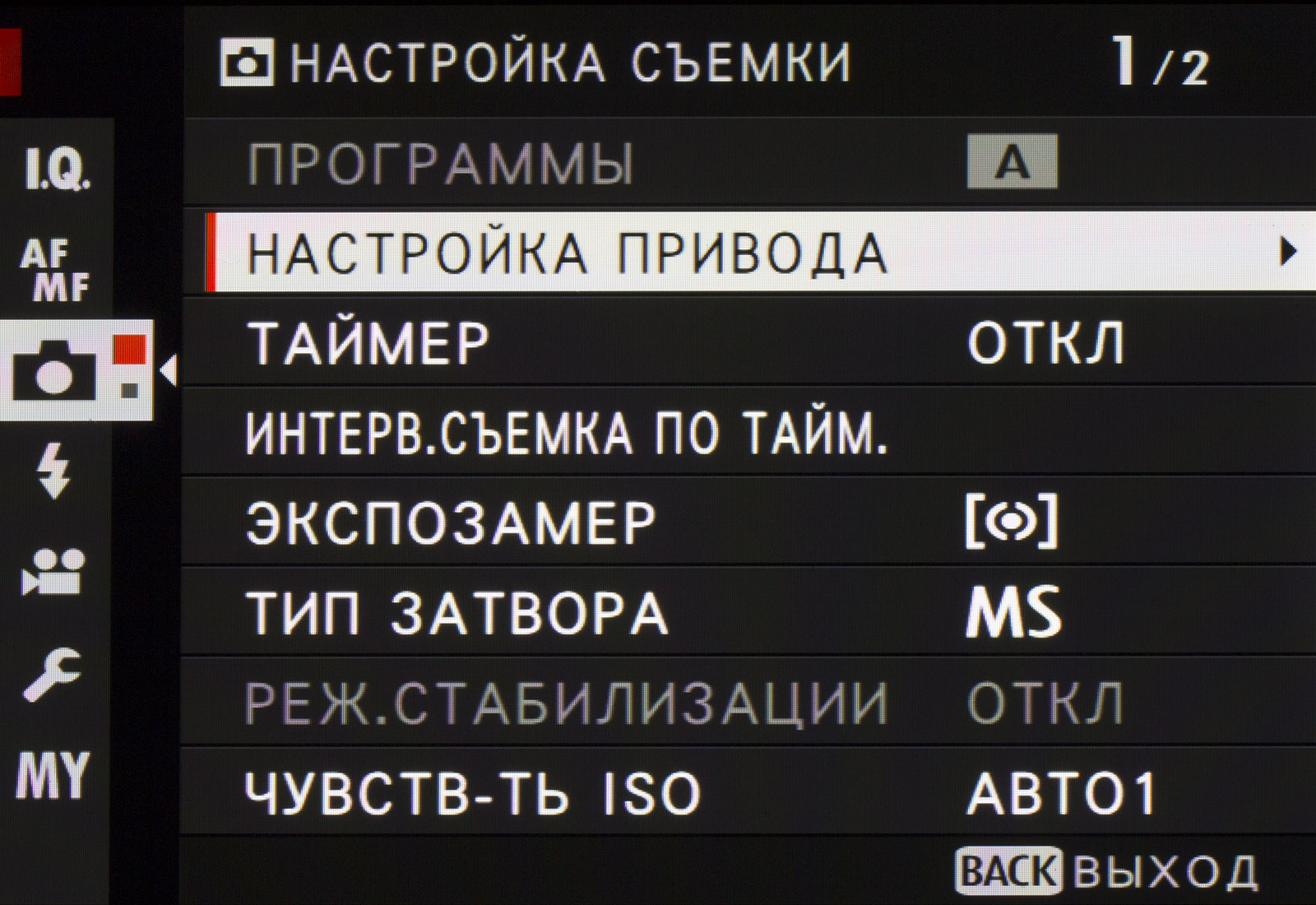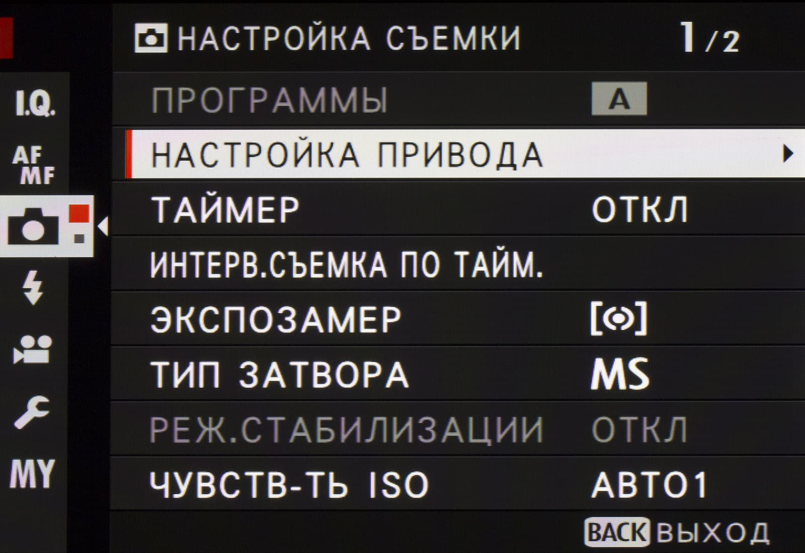 - «Настройка съемки» — здесь сосредоточены пункты настройки «привода» (в частности, брекетинга), таймера, интервальной съемки, затвора, чувствительности и др.