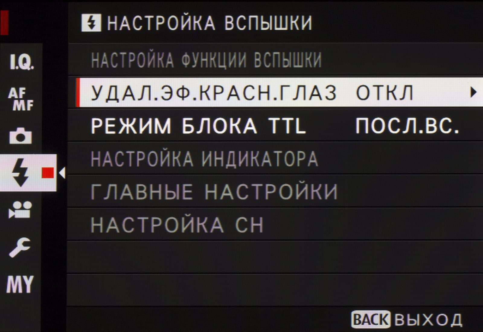 - Вспышка — здесь есть почти профессиональные настройки внешней вспышки: можно выбрать режим работы(TTL, стандарт, медленная синхронизация), выбрать тип синхронизации, настроить индикатор и т. д.