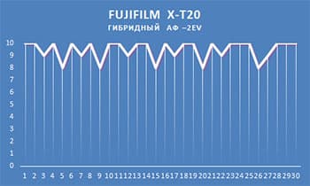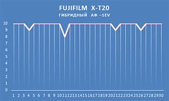 Тест при освещенности −2 EV Fujifilm X-T20 прошла так же медленно, как и флагман, но точность фокусировки осталась высокой, в среднем 9,5 балла.