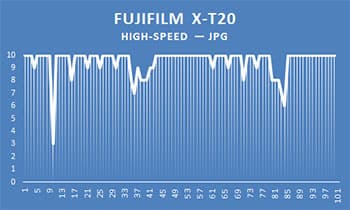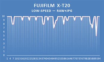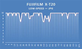И на низкой, и на высокой скорости Fujifilm X-T20 может «щелкать» JPEG до бесконечности. Если точнее, на высокой скорости после примерно 350 кадров буфер все же наполняется и камера переходит в неторопливый режим 1,2 кадра в секунду. До наполнения в режиме Low-JPEG мы получили скорость 4 fps, а в режим High-JPEG — 7,9 fps, практически обещанные в ТТХ 8 кадров в секунду.