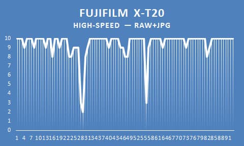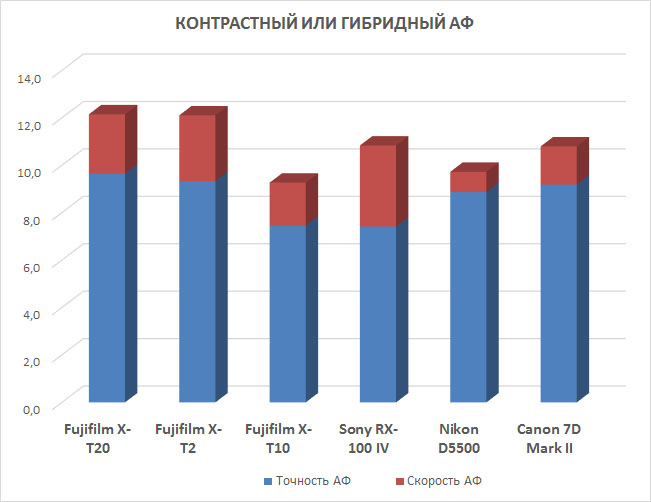 Скорость считается по формуле 200 / (затраченное в двух тестах время), и как видите, она у Fujifilm X-T20 также очень высока. Так что сам собой напрашивается главный вывод этого теста: по совокупности точности и скорости гибридного автофокуса Fujifilm X-T20 — одна из лучших камер, побывавших в нашей лаборатории. Она уступает лишь гораздо более дорогим флагманам Canon, Fujifilm, Nikon и такой беззеркалке, как Leica SL. Но это, как говорится, совсем другая ценовая категория.