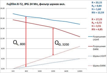 Идем дальше, к сравнению работы Fujifilm X-T20 и X-T2 по тестовым снимкам в JPEG со включенным фильтром шумов. Здесь разрыв по разрешению в светлой сцене — порядка 1,5 различимых мегапикселей, а в темной — чуть меньше 2 Мп. Разница тоже ощутима и хорошо демонстрирует, что качество «шумодава» у флагмана выше (меньшее количество пикселей на матрице становятся неразличимыми). Так, по идее, и должно быть.