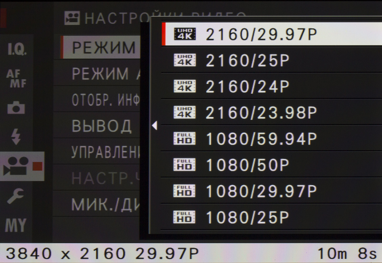 - Максимальная длительность записи 4K-видео составляет 10 минут (у Fujifilm X-T2 с батарейным блоком — 30 минут).
