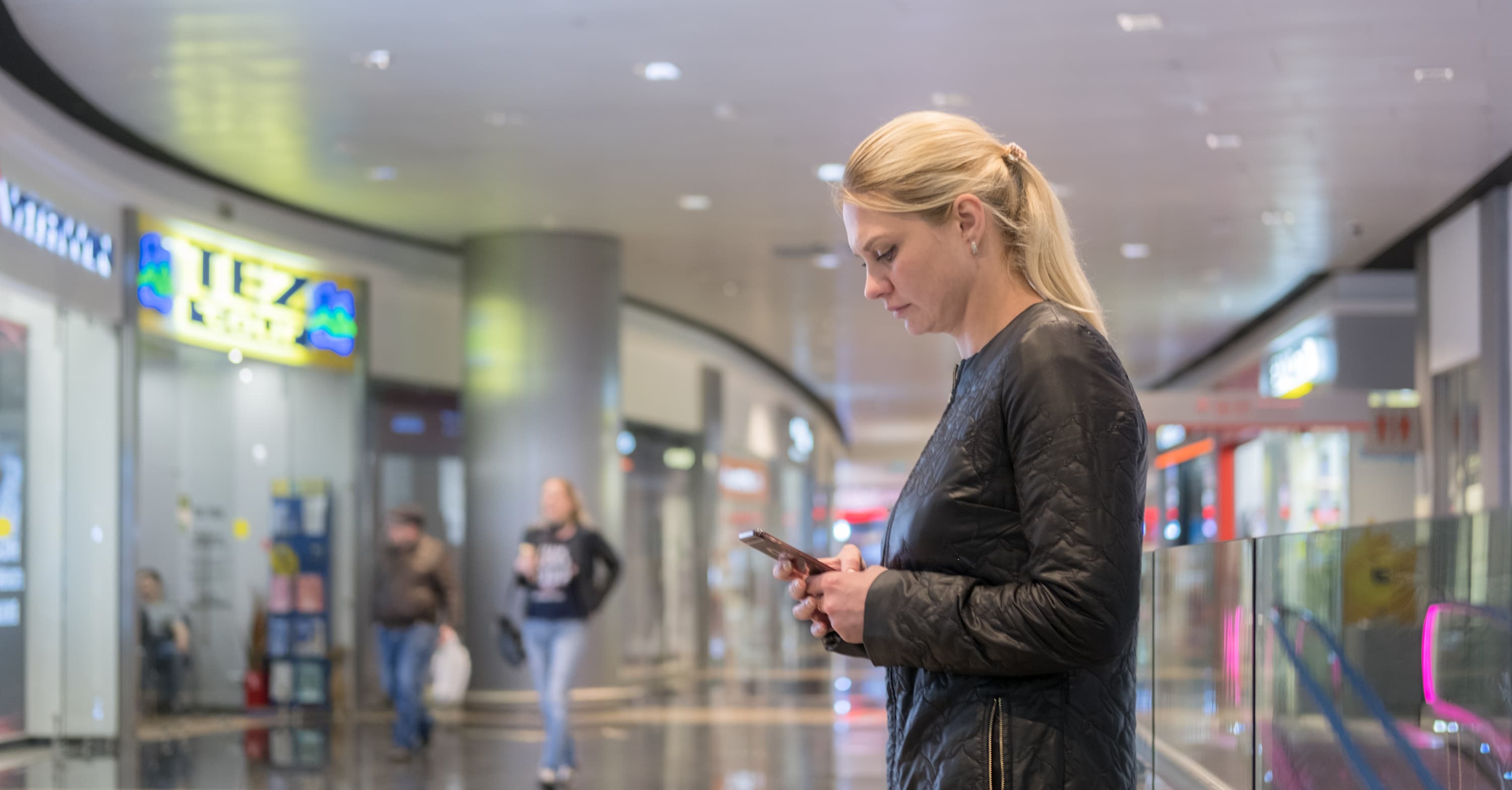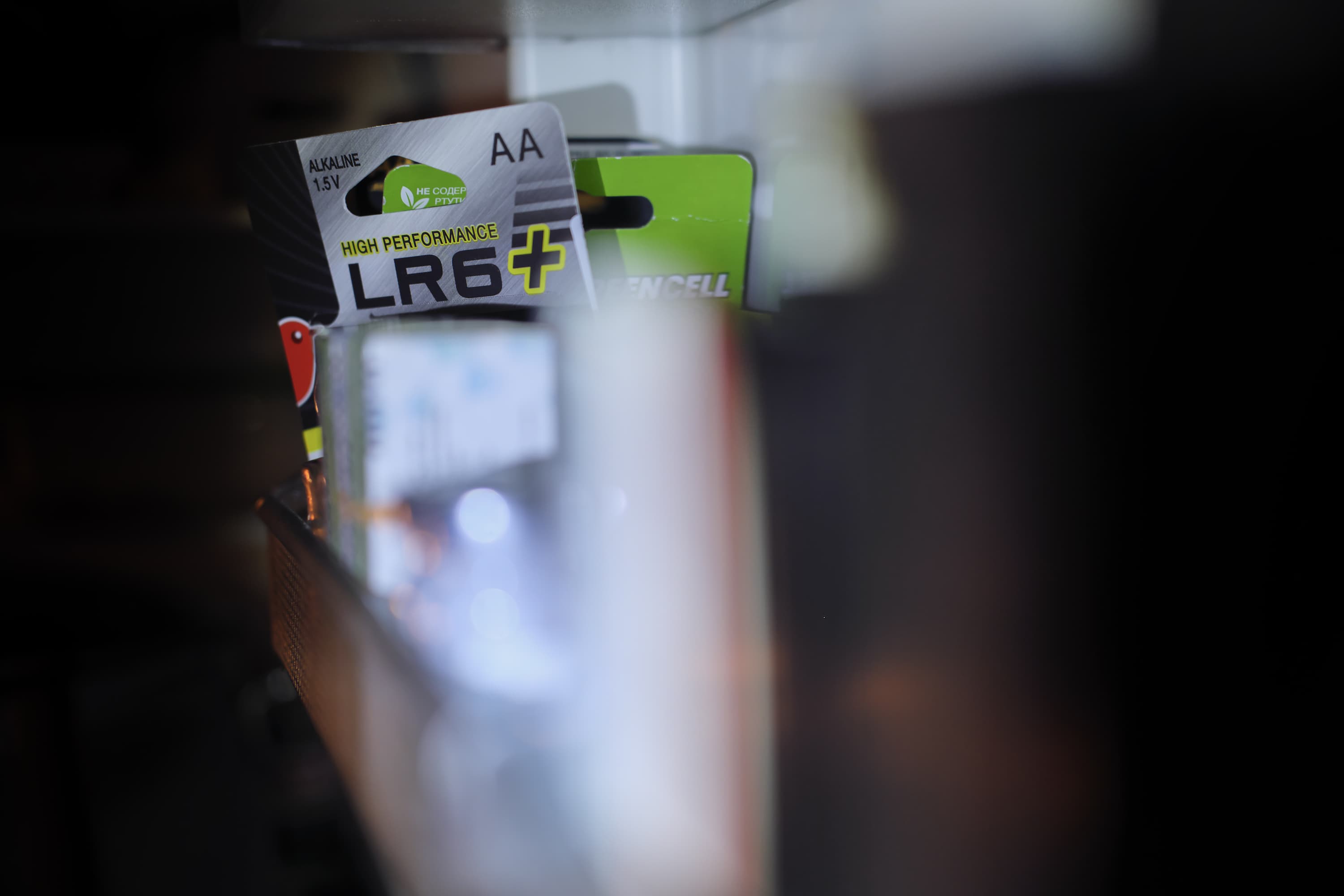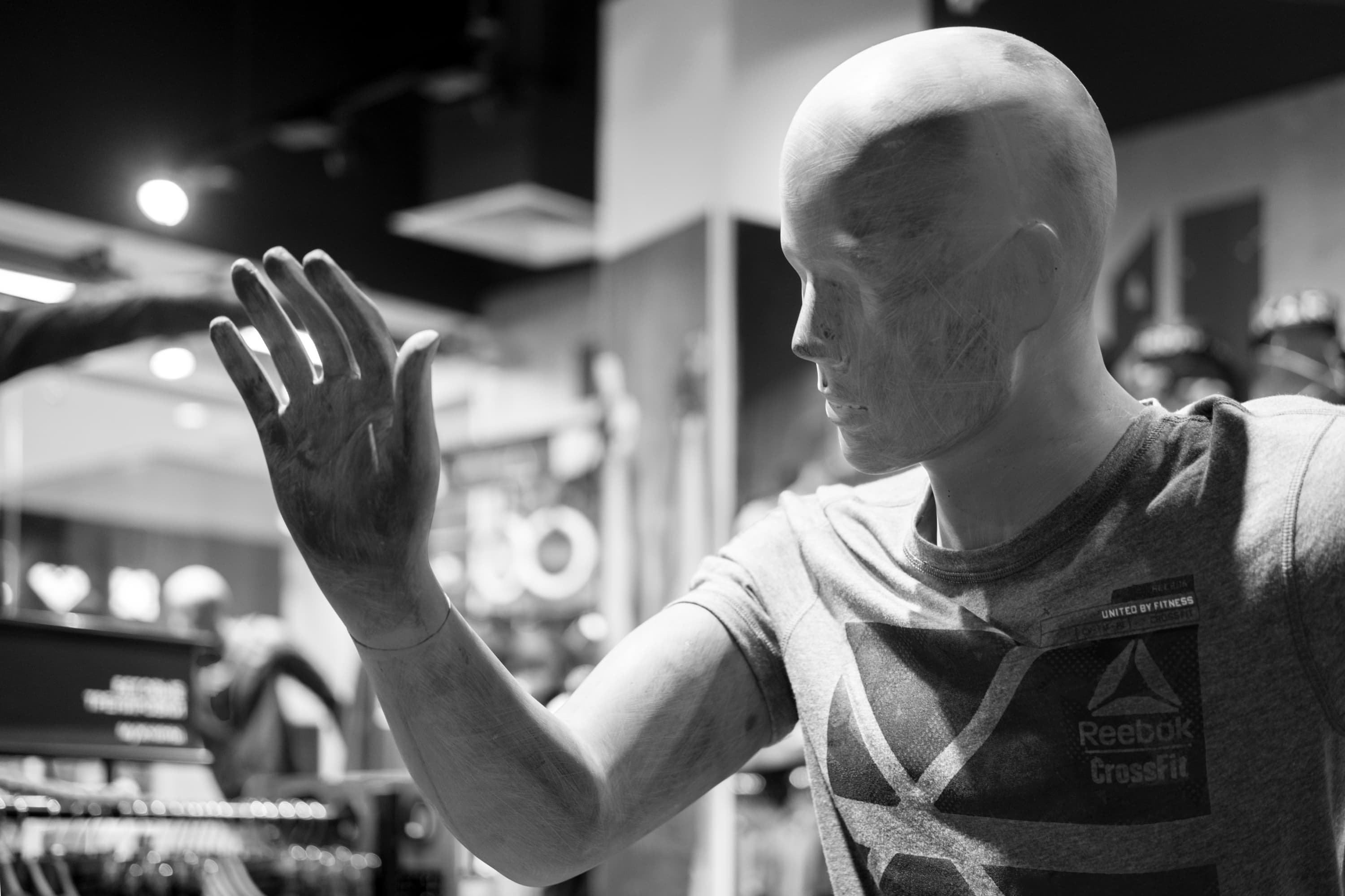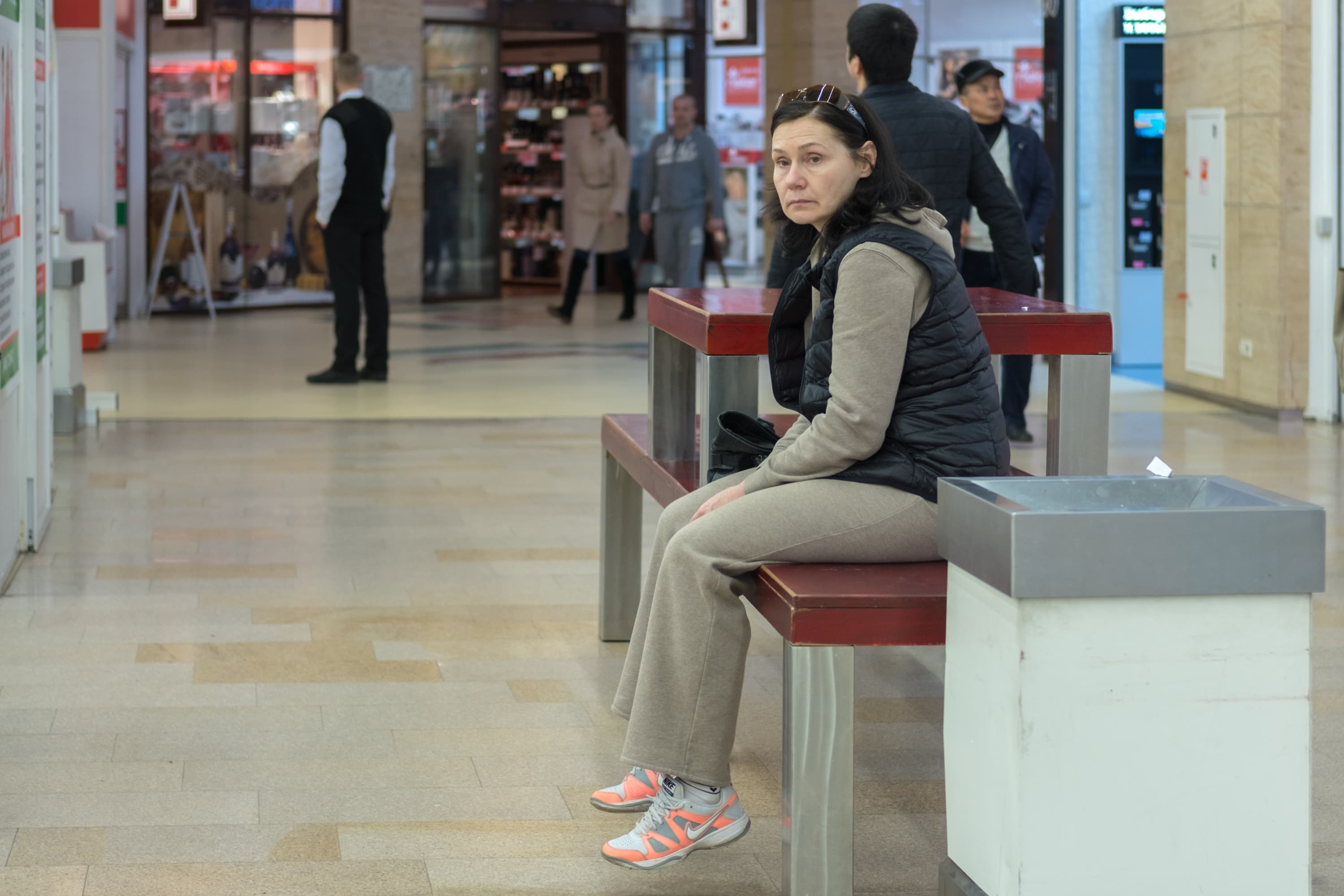 Камера отлично воспроизвела тончайшие нюансы полутонов, причем узкая зона резкости только подчеркивает это. Горизонтальные полосы, заметные в этой области на металлической поверхности трубы-поручня, являются, на деле, отражением витрин, расположенных напротив, и их содержимого.