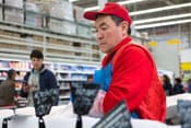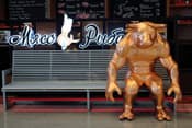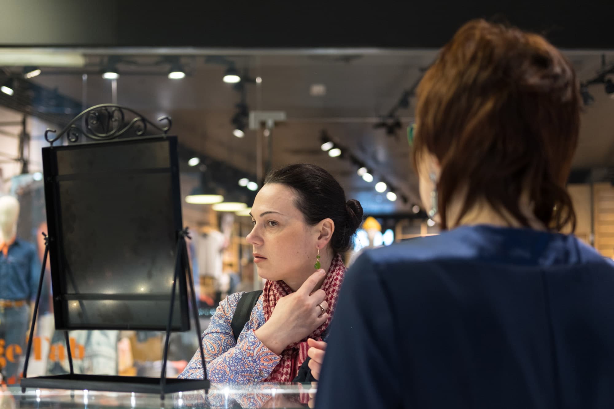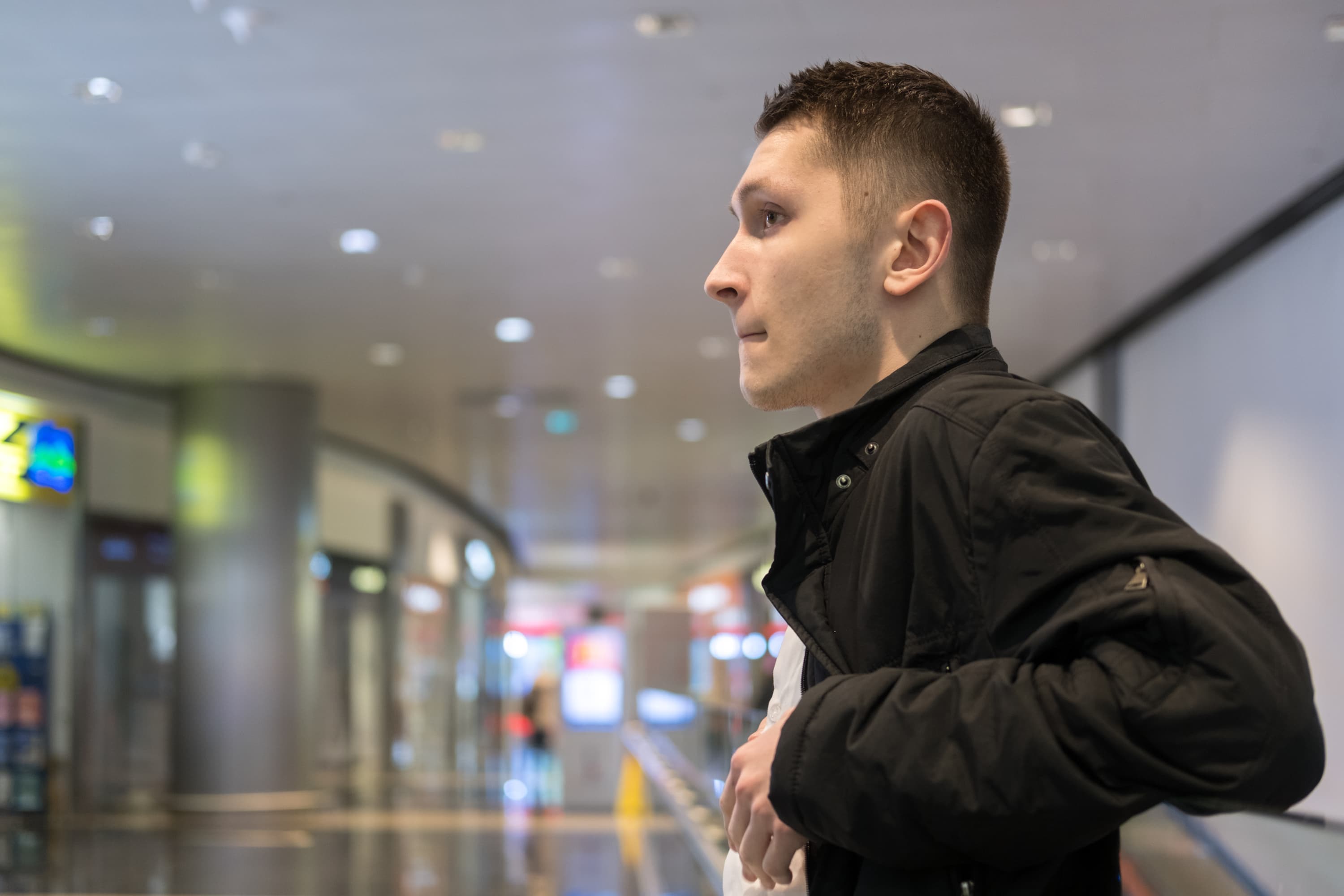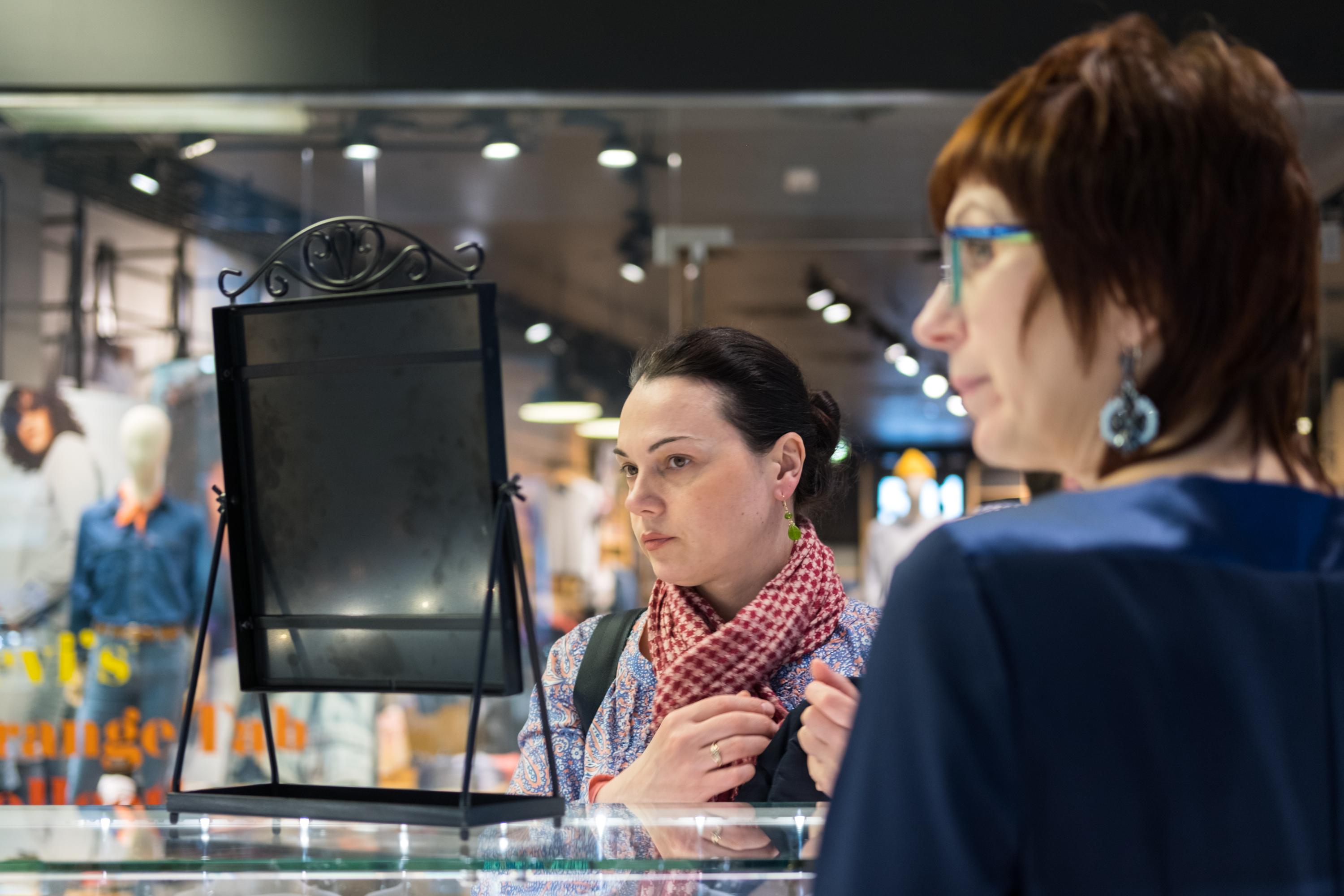 Камера отлично воспроизвела тончайшие нюансы полутонов, причем узкая зона резкости только подчеркивает это. Горизонтальные полосы, заметные в этой области на металлической поверхности трубы-поручня, являются, на деле, отражением витрин, расположенных напротив, и их содержимого.