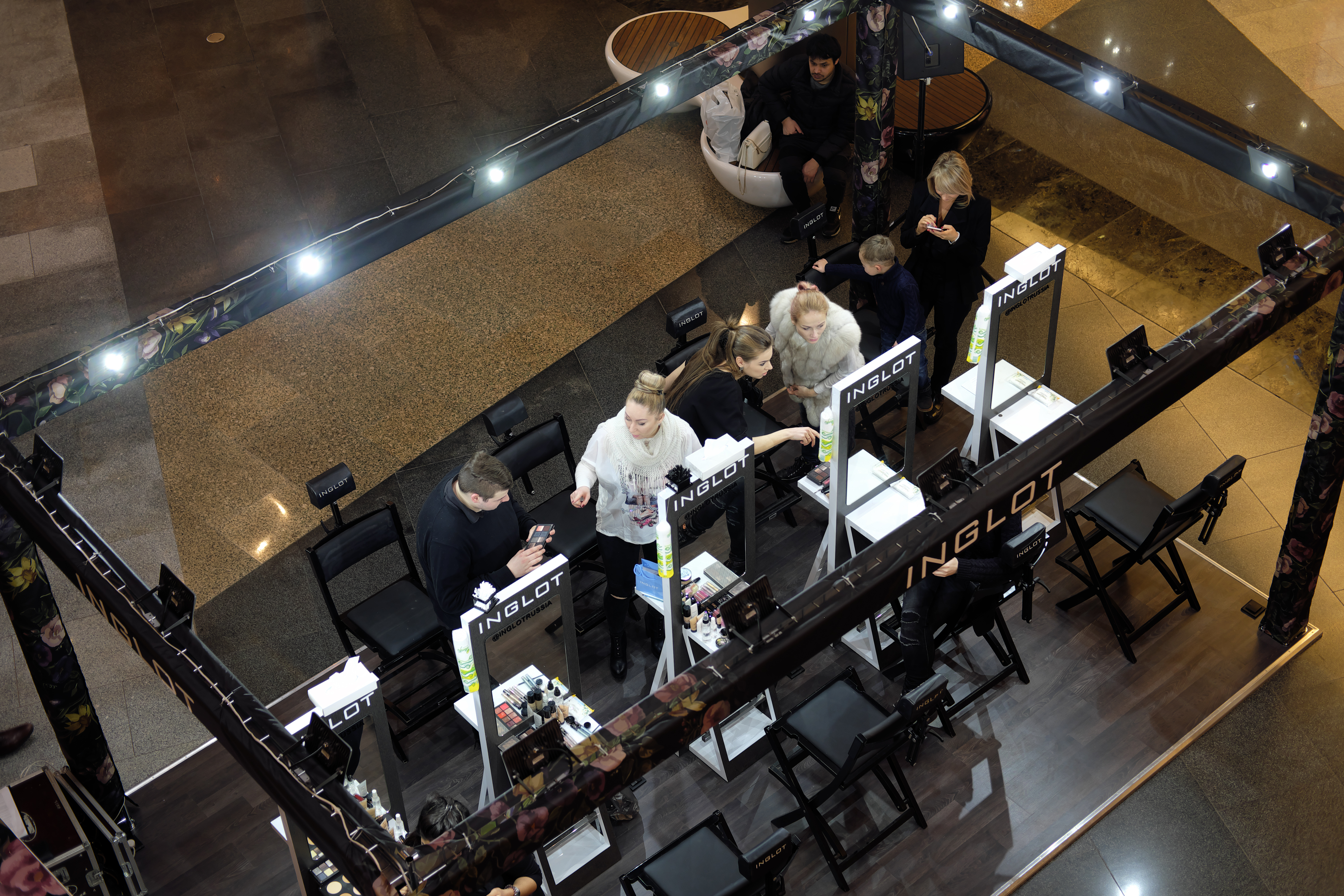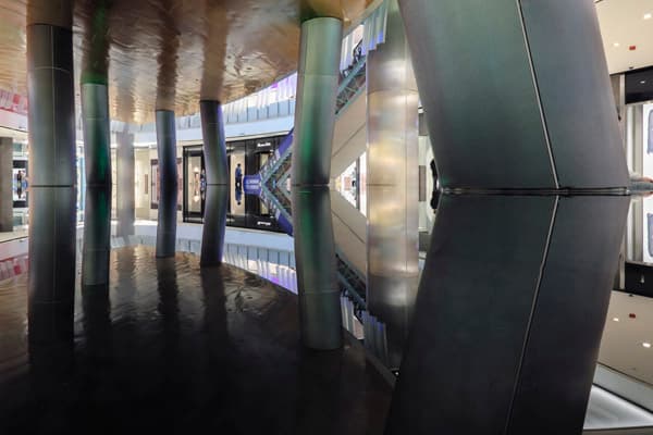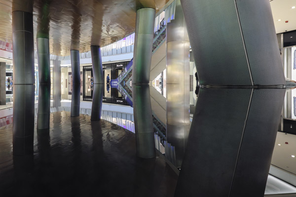 Нижняя, почти проваленная в темноту часть кадра — это идеально ровная поверхность черной каменной плиты, покрытая слоем воды, которая понемногу стекает с приподнятых краев. Интересная фантазия дизайнеров и строителей, а для нашего испытания — хорошая мишень. Прямоугольные формы на этой почти черной поверхности — это отражение плиток, расположенных на потолке. Уже сам факт того, что их рисунок хорошо различим, подтверждает способность матрицы камеры воспроизводить детали в густых тенях.