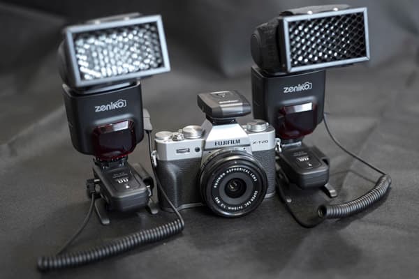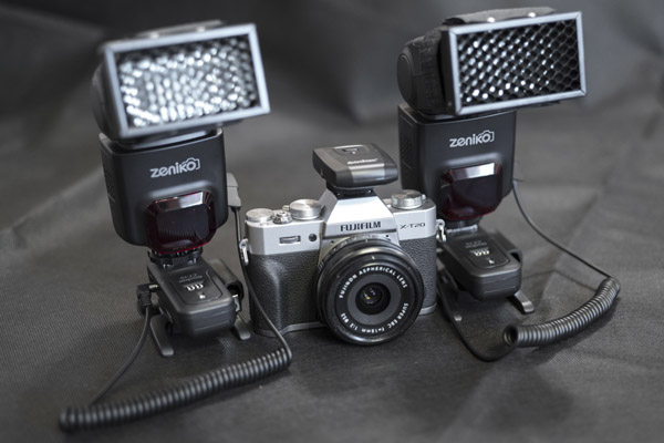 | Мини-комплект импульсного света из двух вспышек Zeniko GN33 с приемниками синхросигнала и Fujifilm XT-20 с радиотриггером |