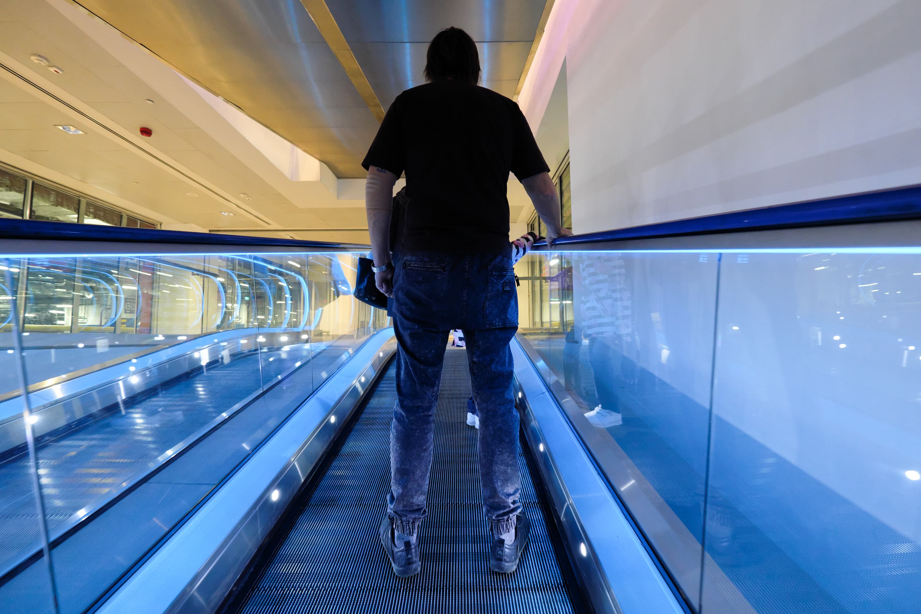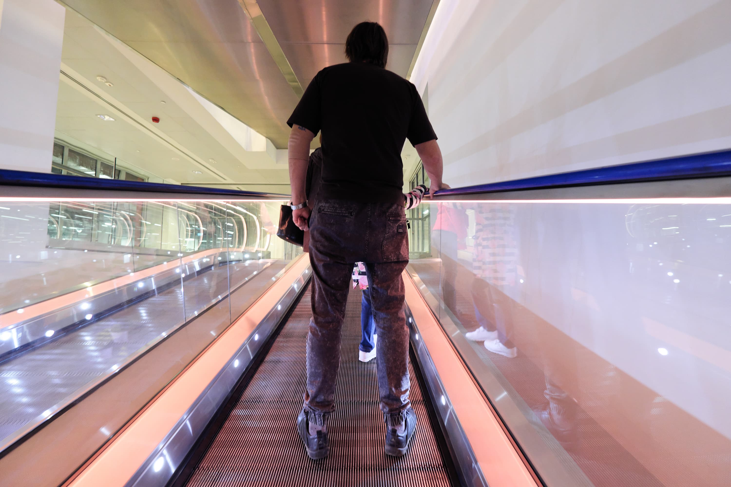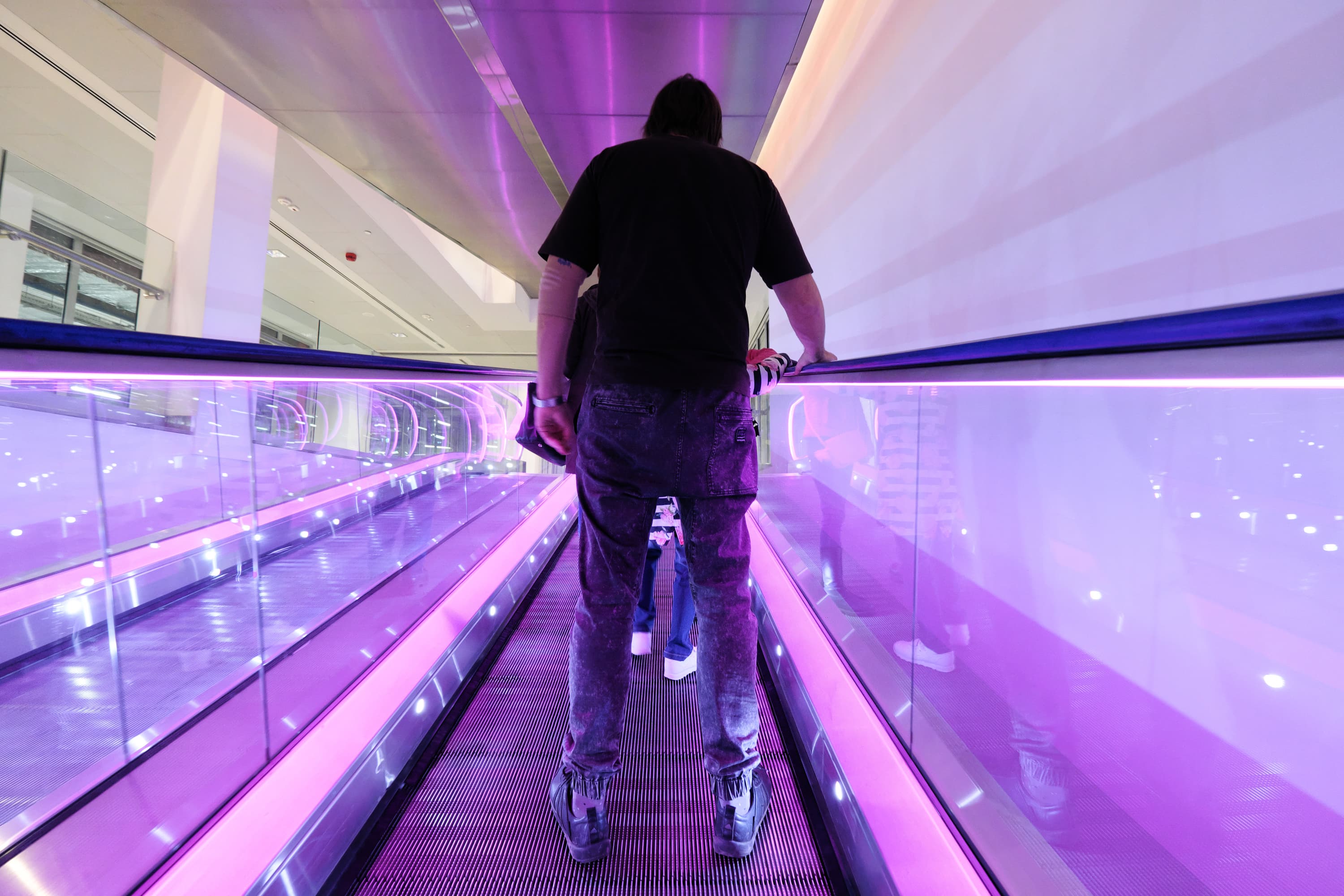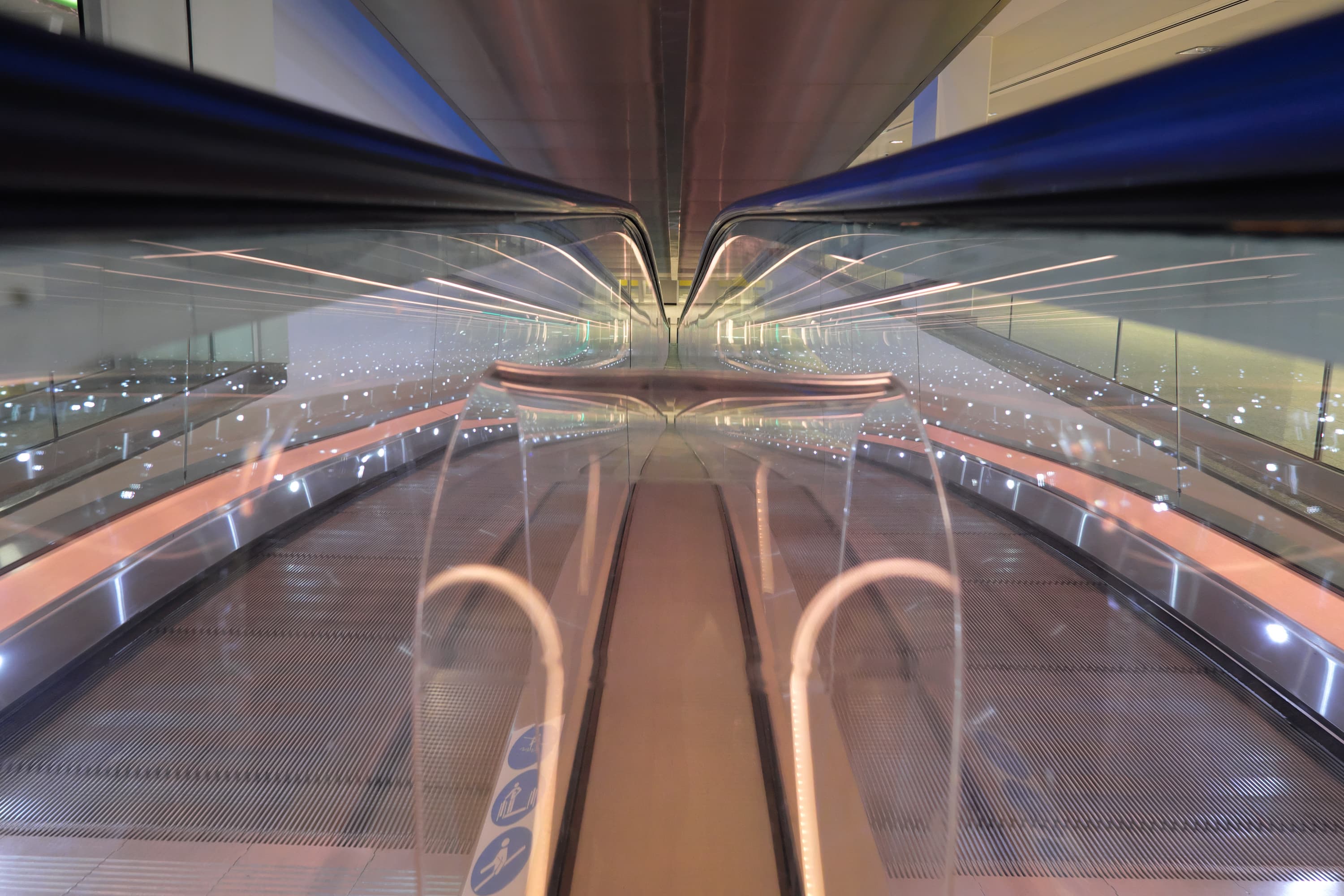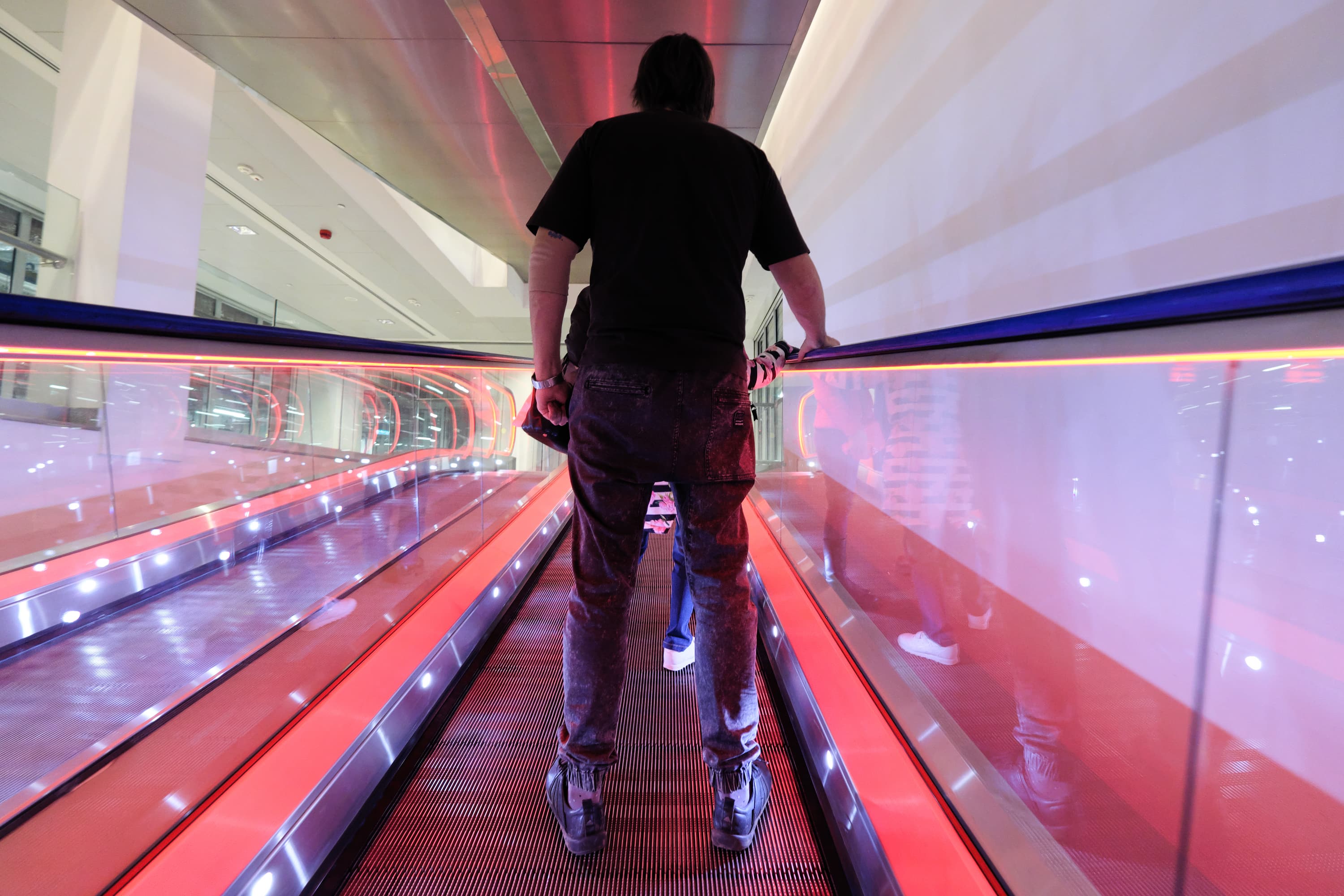 Вот разные варианты цветного освещения траволатора бизнес-центра без дополнительной обработки. Параметры съемки одинаковые: фокусное расстояние 10 мм; F4; 1/60 с; ISO 3200. Одновременно с АББ можно оценить также скорость и точность работы автофокуса. Съемка производилась с рук, «навскидку», последовательной серией кадров с повторной однократной автофокусировкой для каждого из них. Автофокус ни разу не ошибся.