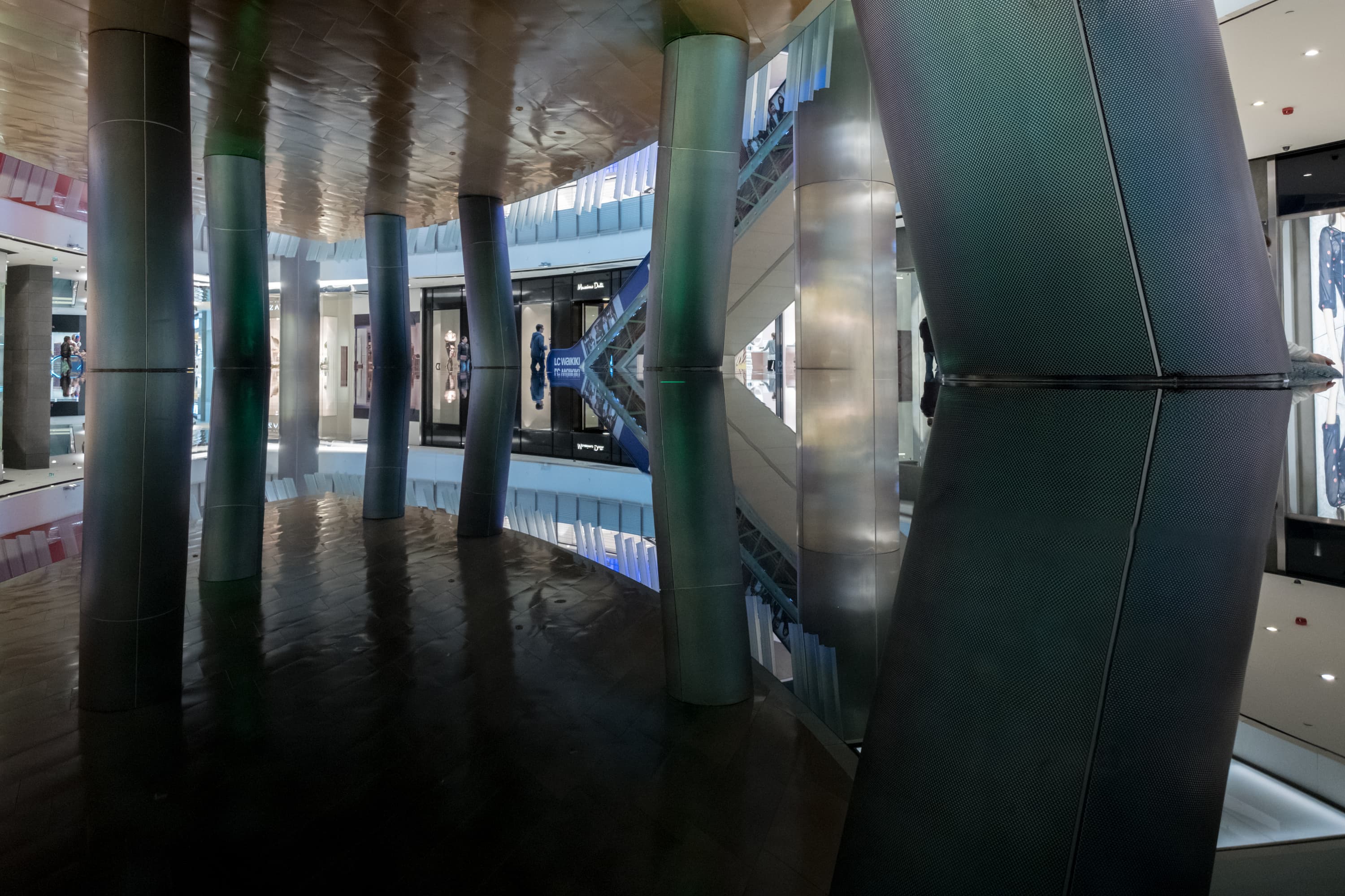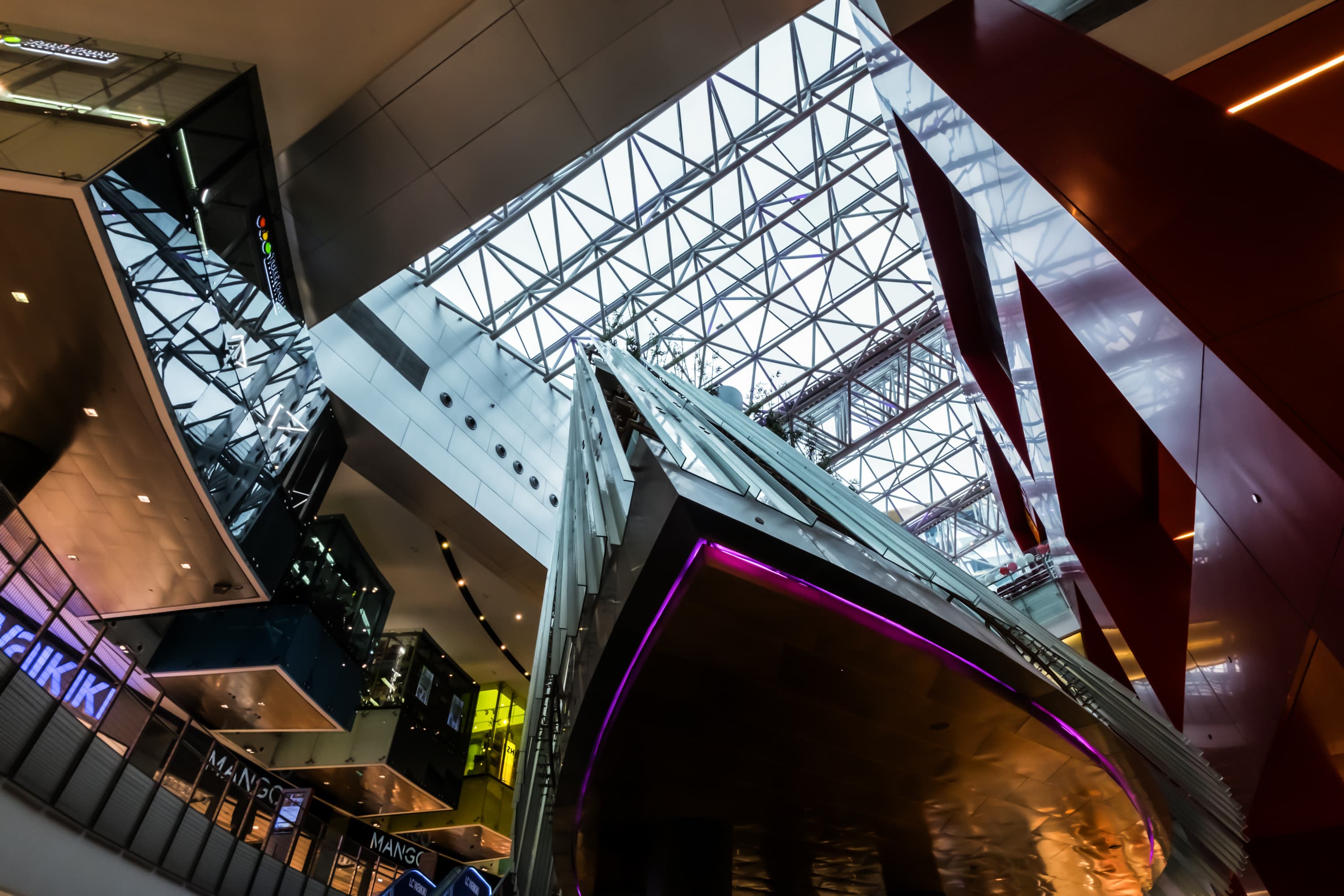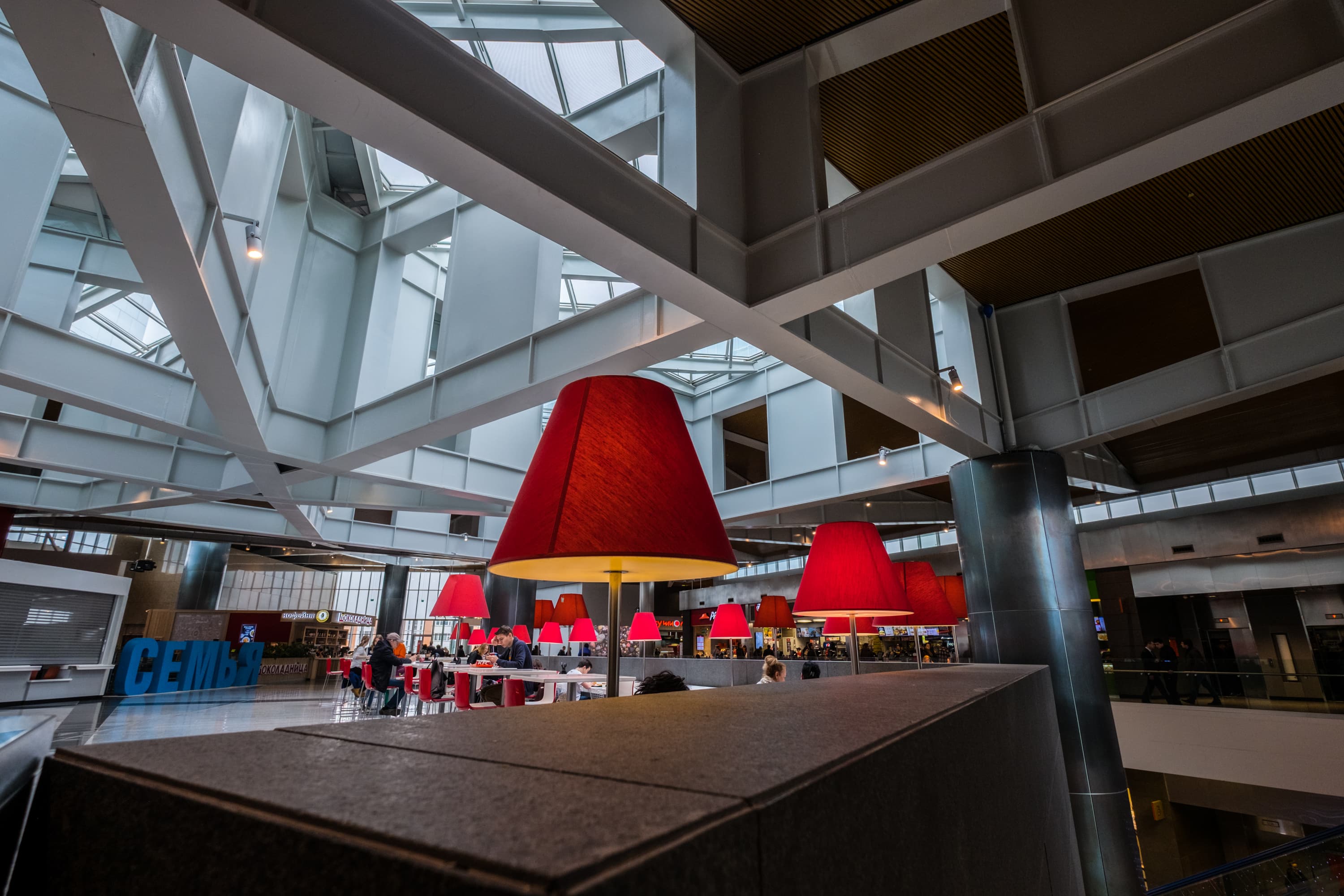 При съемке интерьеров торгового центра на полностью открытой диафрагме видим достаточно широкий диапазон полутоновых переходов от весьма густых теней до умеренно интенсивных светов. В наиболее ярких участках светов детали, конечно, утрачиваются, но это все-таки особенности сенсора камеры, а не объектива.
