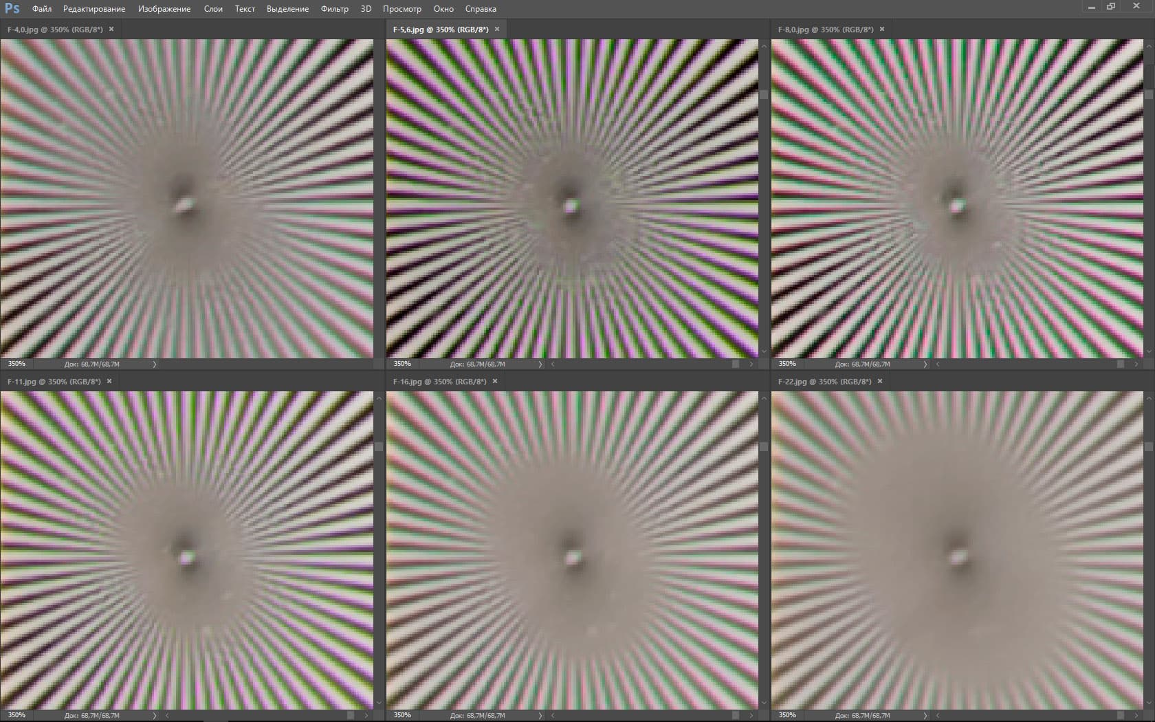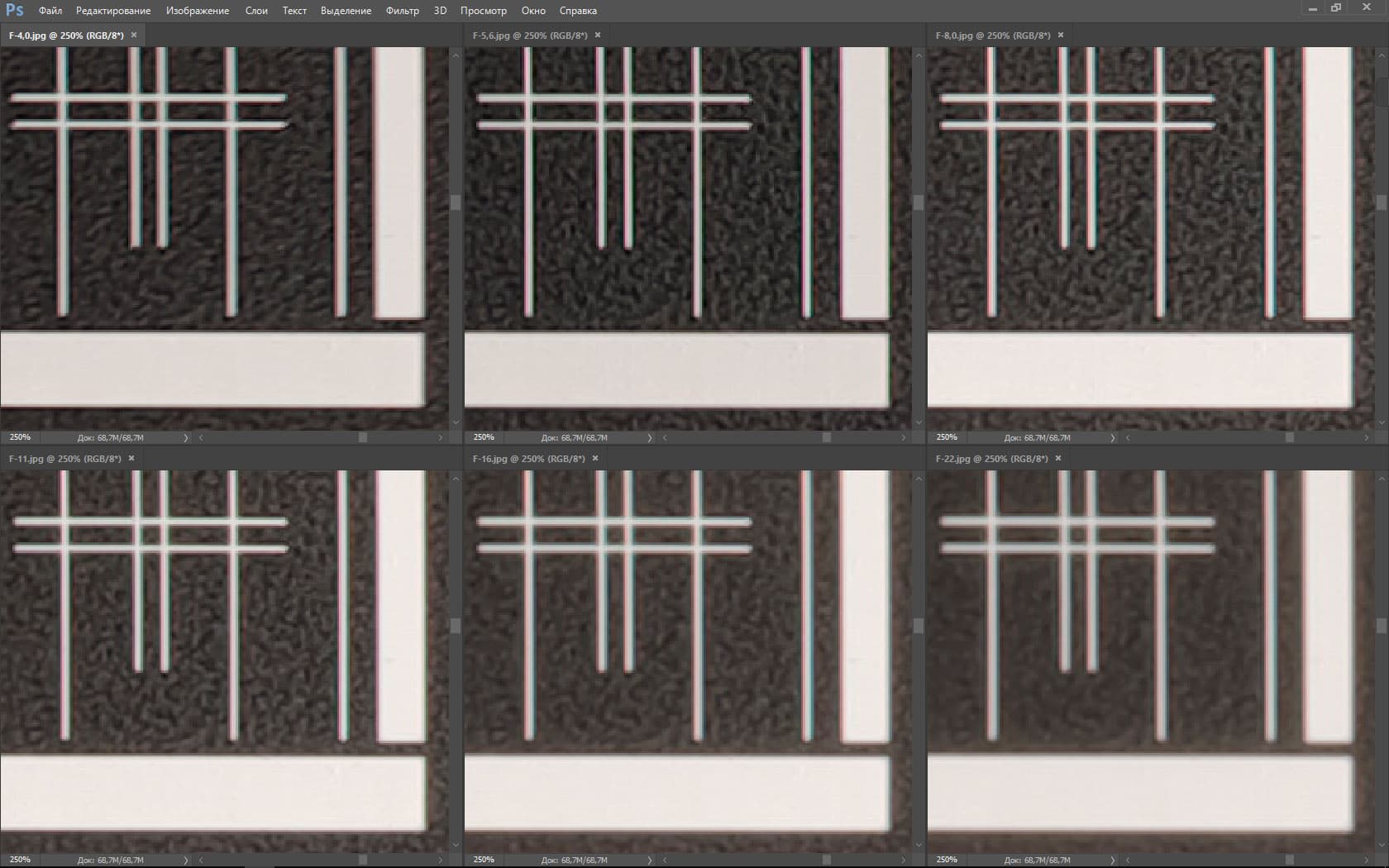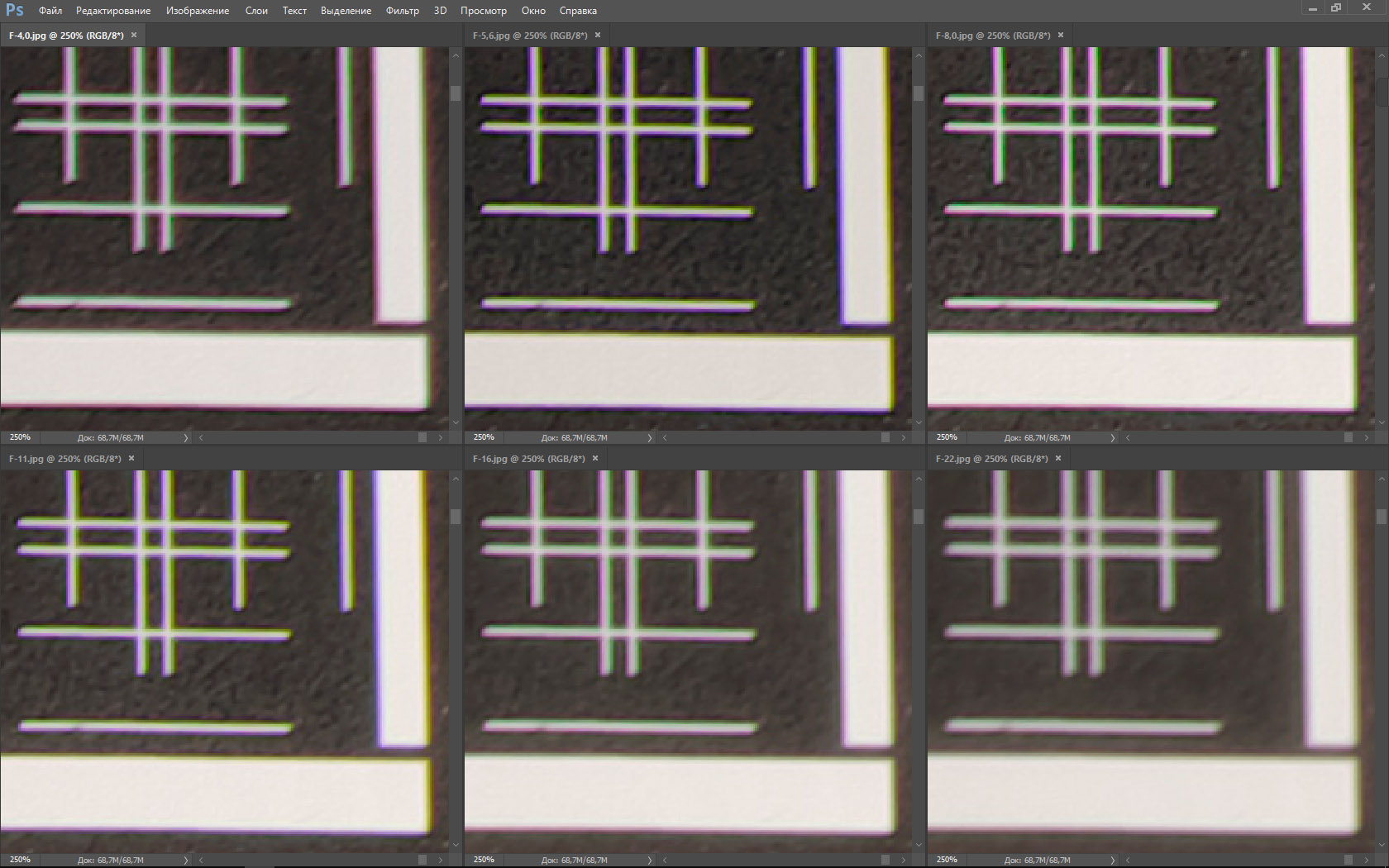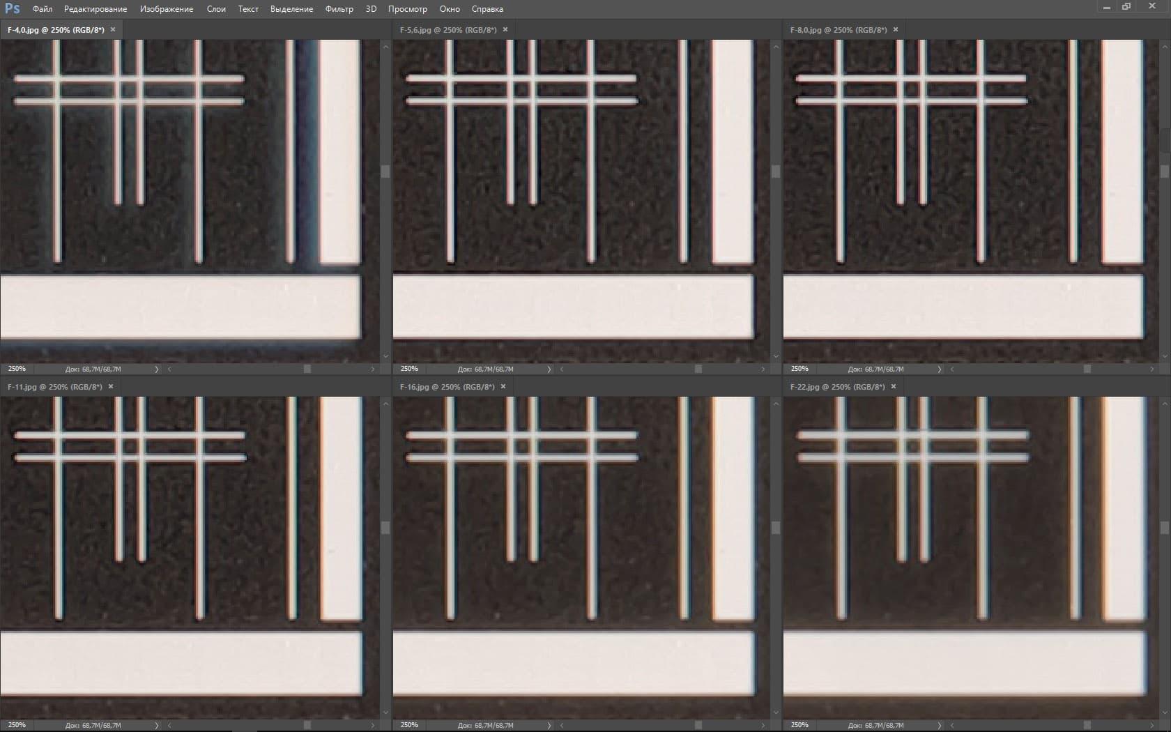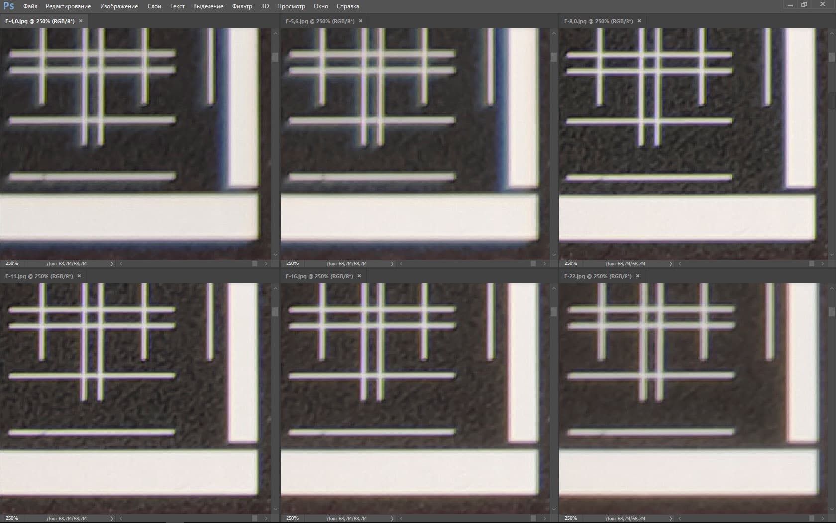 | На всех скриншотах: верхний ряд: f/4,0 — f/5,6 — f/8,0, нижний ряд: f/11 — f/16 — f/22 | |||