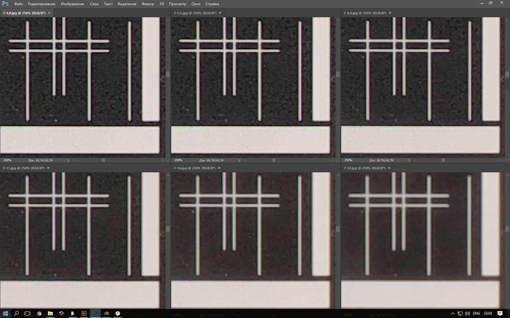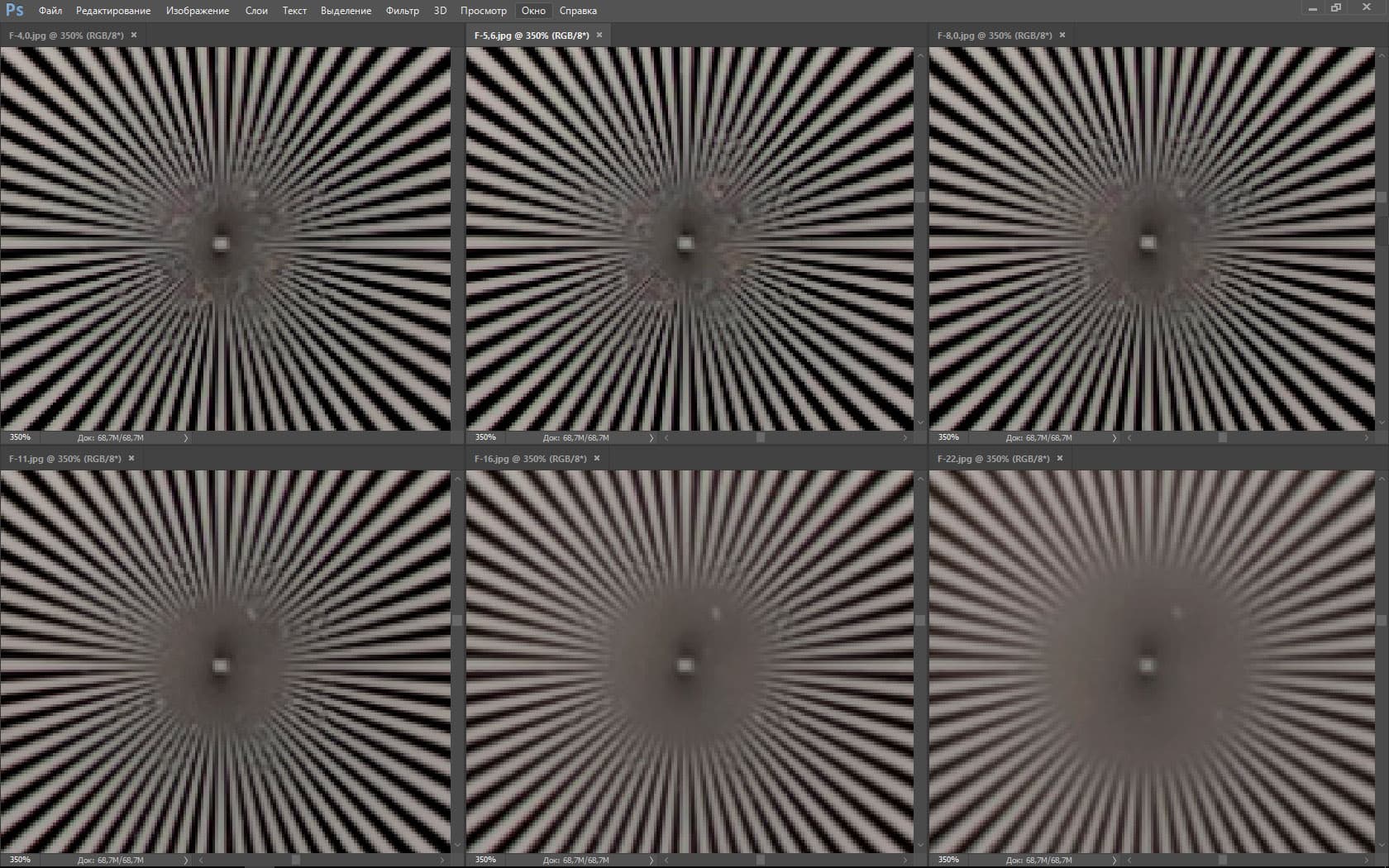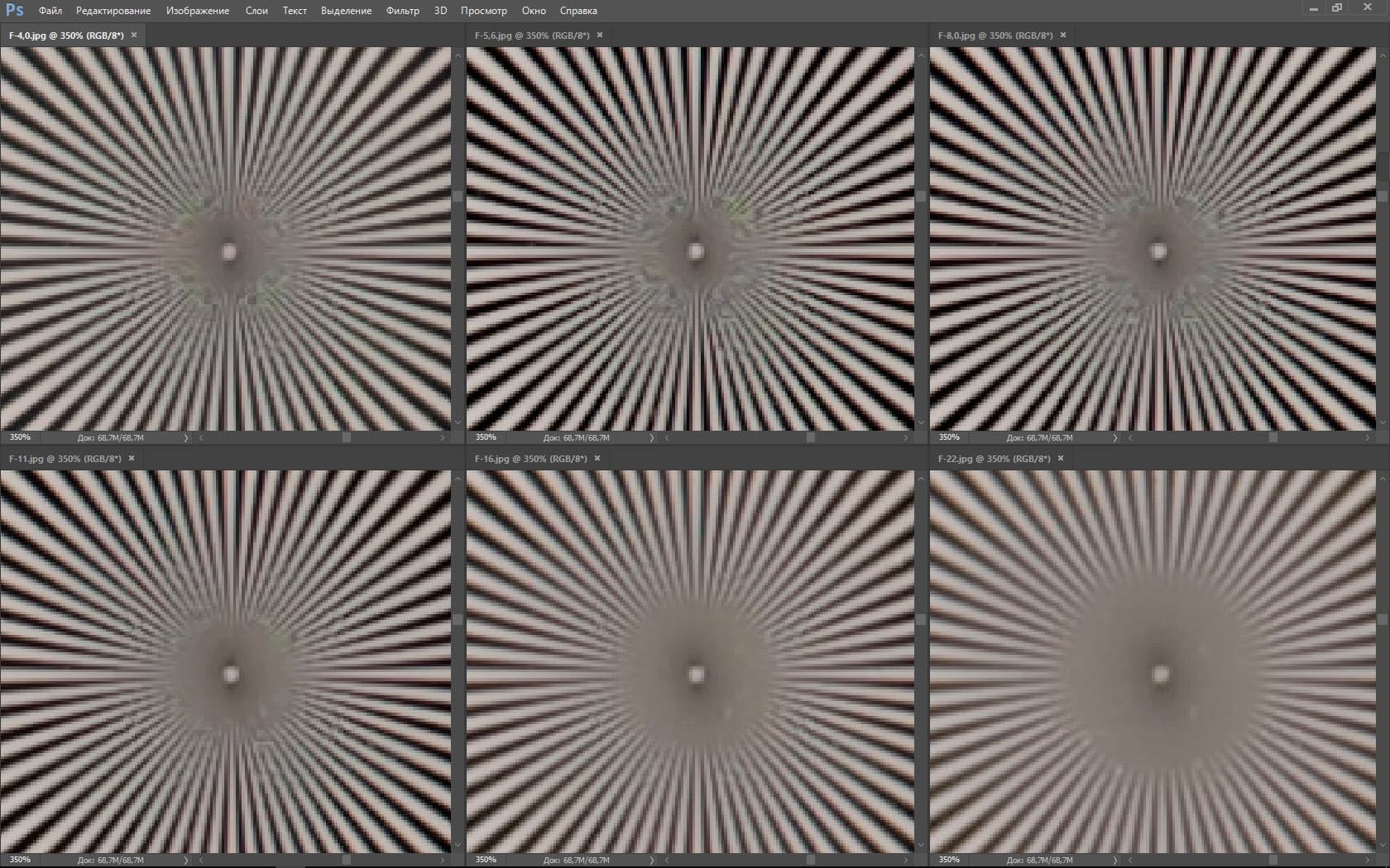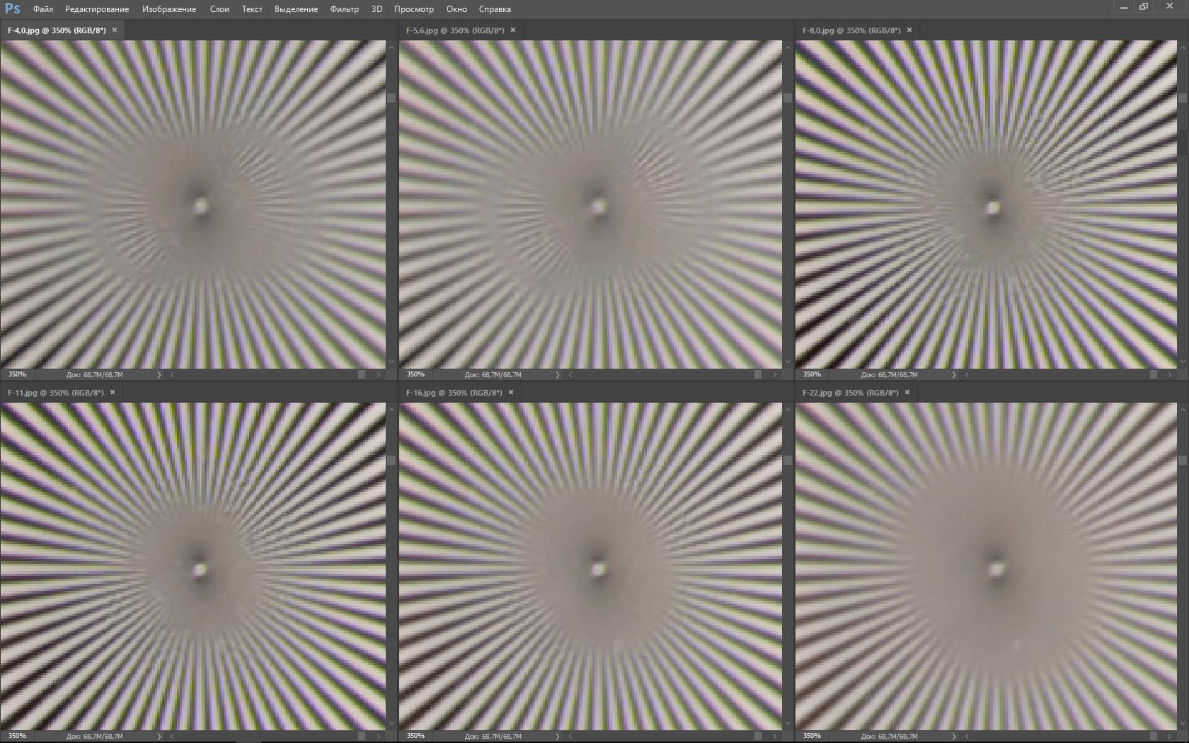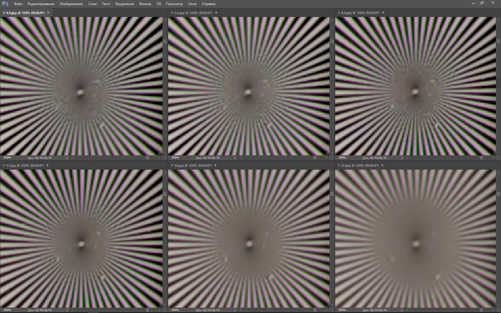 | На всех скриншотах: верхний ряд: f/4,0 — f/5,6 — f/8,0, нижний ряд: f/11 — f/16 — f/22 | |||