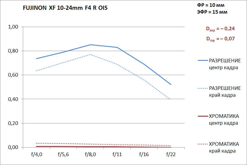 Общий вывод: Fujinon XF10-24mm F4 R OIS — широкоугольный зум с полностью выправленной дисторсией. У него самое малое фокусное расстояние (10 мм) и самый большой угол обзора из всех оптических инструментов Fujinon XF, аналогов он не имеет. Характеристики объектива высоки, а положительные стороны явно перевешивают недостатки.