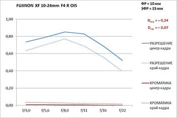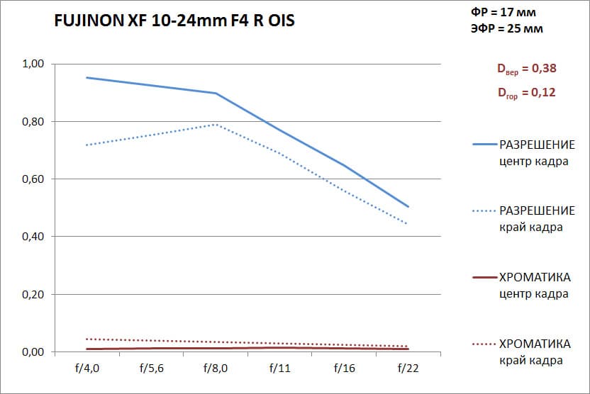 Разрешение в диапазоне f/4—f/16 в центре кадра — высокое и очень высокое (снижается от 0,95 линии на пиксель до 0,7 линии), но на закрытой диафрагме падает до 0,5 линии. Разрешение на краю кадра заметно отстает от разрешения в центре, но все равно остается высоким в диапазоне f/4—f/16. Хроматические аберрации заметны только на краю кадра на широкой диафрагме, а начиная с f/11 становятся почти незаметны. В центре кадра «хроматика» почти не видна во всем диапазоне диафрагм.