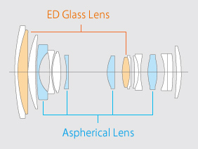 Оптическая схема объектива состоит из шестнадцати элементов, объединенных в двенадцать групп. В нее включены целых четыре асферические линзы (для повышения резкости изображения) и две из специального стекла с аномальной дисперсией. Введение последних в конструкцию оптического инструмента дает возможность минимизировать латеральные хроматические аберрации, повысить резкость и контраст изображения и обеспечить чистое воспроизведение цветов.