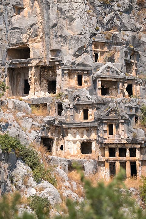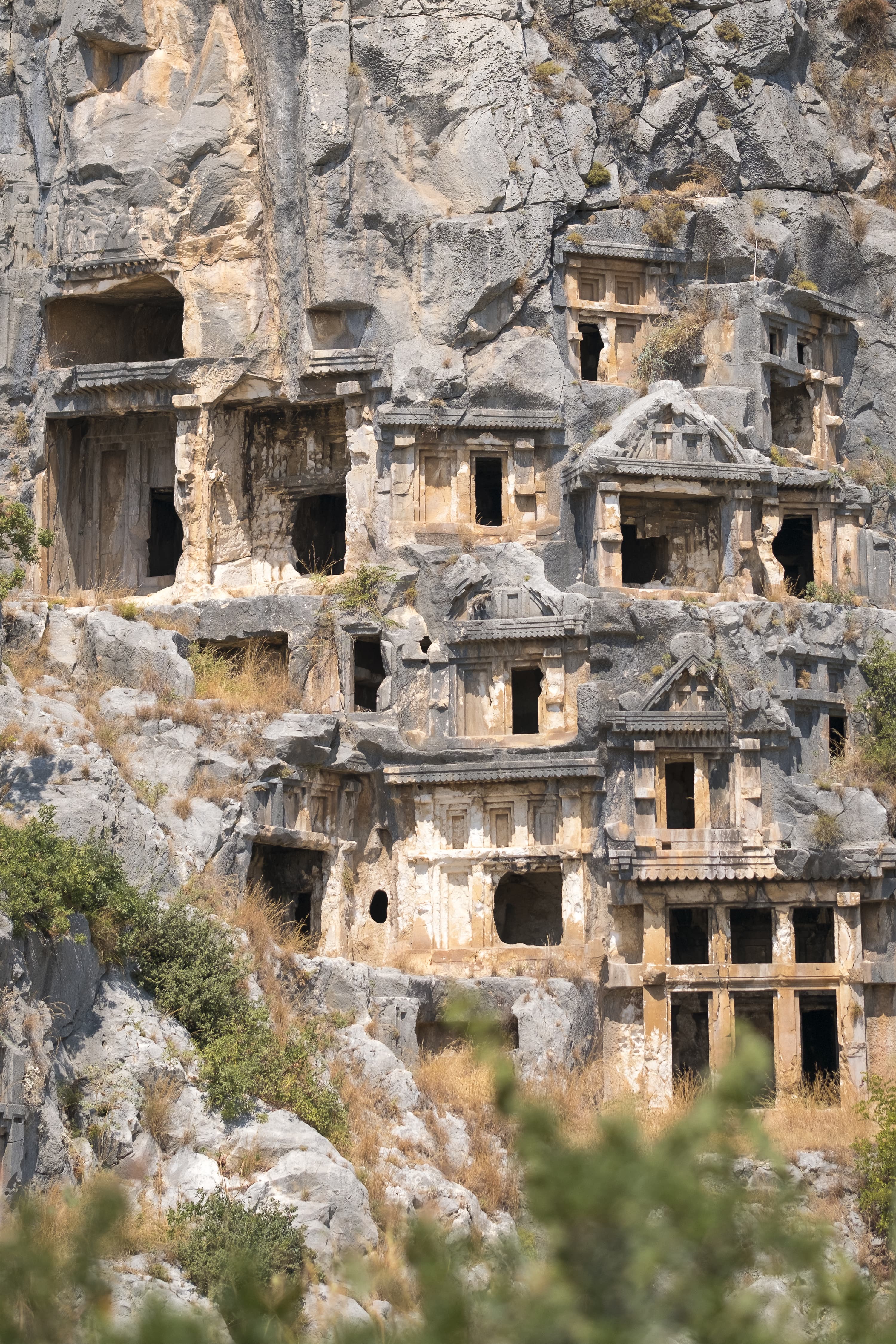 Фокусировка производилась по заднему плану, поэтому листья кустарника на переднем оказались в зоне нерезкости. Правда, сказать что-либо о фронтальном бокэ сложно, потому что объекты размыты, как говорит один из наших друзей-коллег, «в хлам». Мы вернемся к изучению этого эффекта позднее. А вот резкость и детализация на среднем и дальнем планах просто отменная. Посмотрите на зеленые кустарники и желтую траву — лист к листу! На фасадах гробниц прекрасно различаются не только их каменные детали, цветные пятна и полутоновые переходы, но и сама фактура поверхности — от шершавой и гладкой в местах обработки до «сахарной» в местах сколов камня и ноздреватой, словно губка, на необработанных поверхностях вулканического туфа.