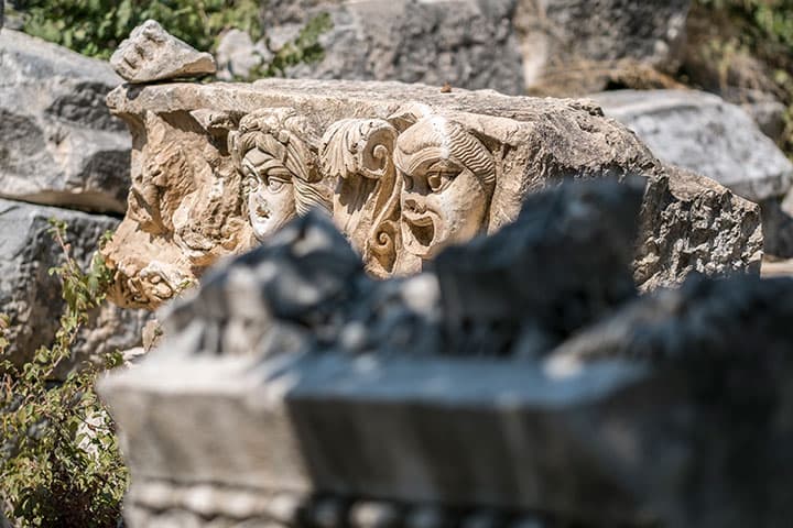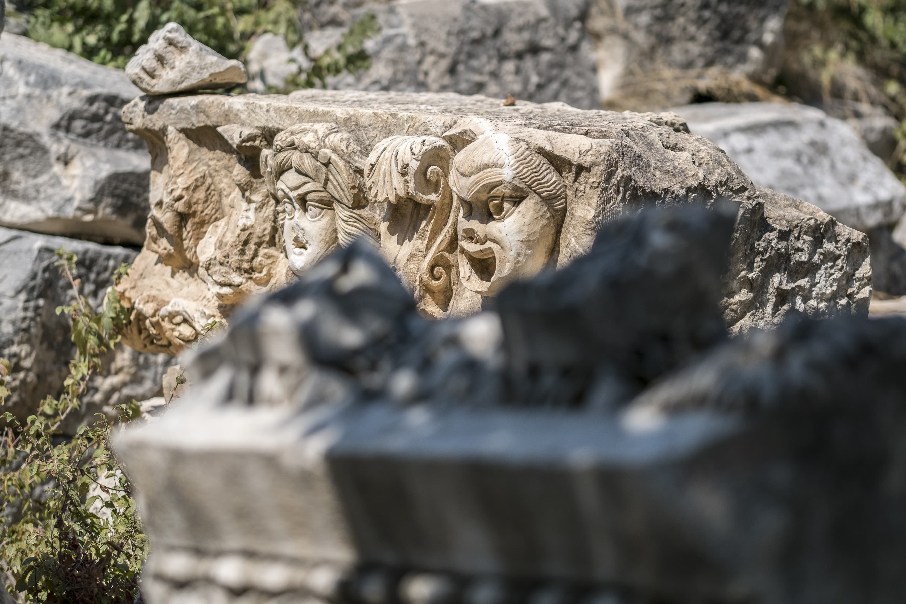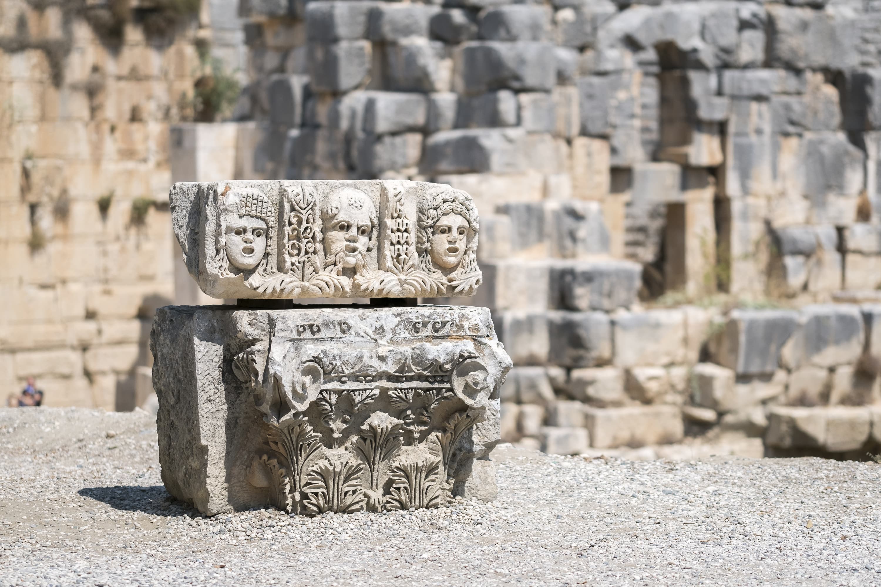 Вот подтверждение замечательной резкости и детализации объектов на среднем плане. Полное раскрытие диафрагмы позволило размыть обломок на переднем плане и каменные блоки на заднем. А маски в зоне резкости и детали декора прорисованы четко, объемно, живо. Великолепно заиграла на свету фактура обработанного камня и даже проявились огрехи кое-как заделанной трещины в нем.