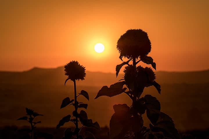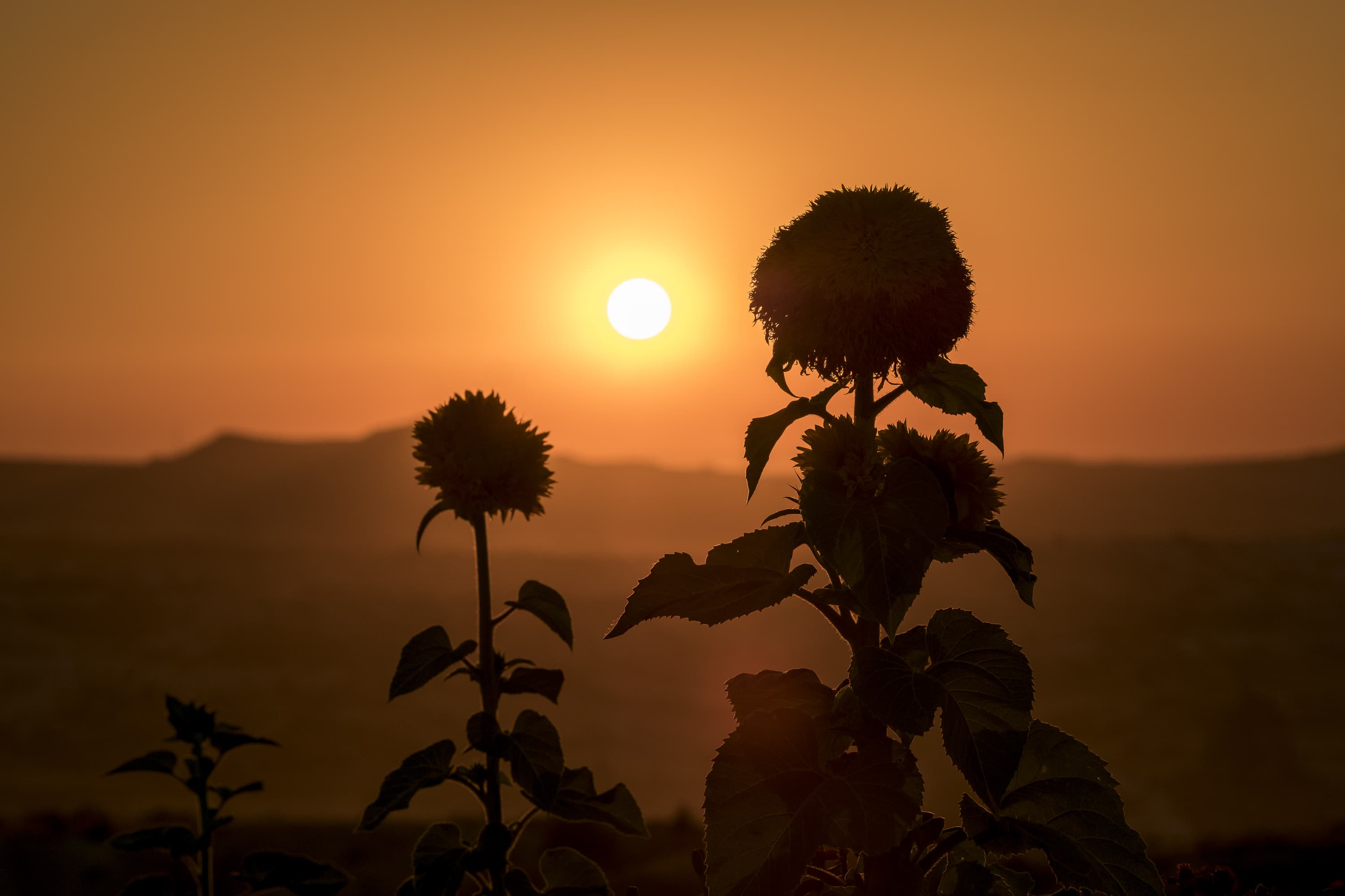 Объектив сильно диафрагмирован, чтобы активнее визуализировать левый подсолнух и не «потерять» в размытии солнца и гор на заднем плане. Желтые, оранжевые и коричневые тона воспроизведены отлично. Реальность цветовой гаммы раннего заката не вызывает нареканий. Резкость правого подсолнуха просто великолепная; вдобавок, отлично проработана подсветка листьев световым контуром сзади.