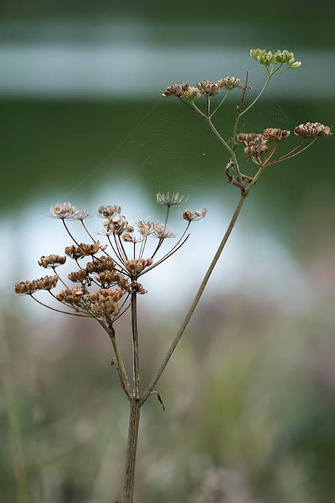 Оценим детализацию воспроизводимого изображения при съемке крупным планом (удаление от объекта около 1,5 м). Семена и волоски в зоне резкости выглядят практическим безупречно. Отлично видны белые нити двух паутин, нижней и верхней, на буром засохшем болиголове.
