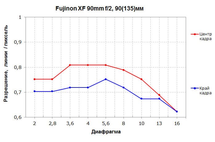 Fujinon XF 90mm F2 R WR демонстрирует весьма высокую разрешающую способность начиная с открытой диафрагмы и до F13, когда ее уже заметно ограничивает дифракция. При этом в центре кадра разрешающая способность лишь ненамного выше, чем на периферии.