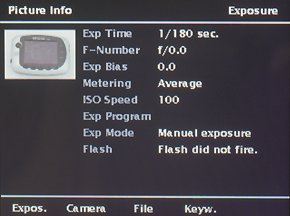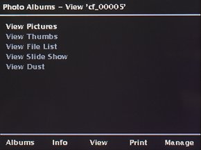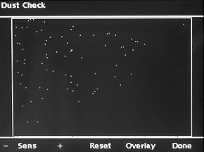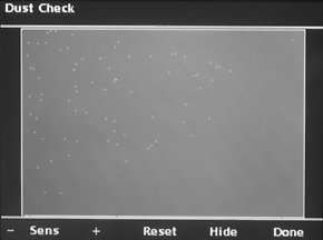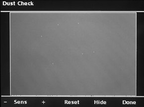 Кроме того, предоставляется возможность просмотра информации из заголовка EXIF, просмотра каждого канала в отдельности и вывод на экран гистограмм значения яркости. Весьма важным режимом, который может оказаться той самой каплей, которая может перевесить выбор фотографа в сторону данного устройства, является режим контроля пыли при смене объектива. Предлагается снять равномерно окрашенное поле при максимально закрытой диафрагме, переписать фотографии на винчестер и просмотреть их в специальном режиме. В этом случае все точки, выделяющиеся на общем фоне, будут выделены, причем пороговую чувствительность можно менять.