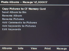 При включении появляется заставка, сообщающая о заряде батарей и свободном месте на диски, и предлагающая выбрать род деятельности | Меню работы с фотографиями |