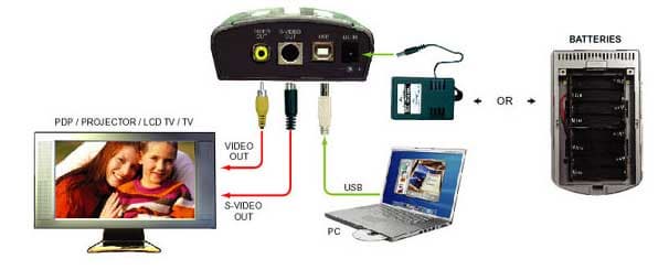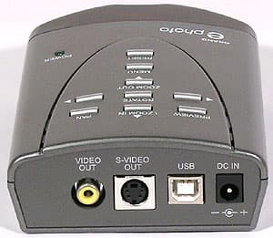 Все разъемы сконцентрированы на задней панели (слева направо): Video и S-Video выходы, USB-разъем типа B (несмотря на то, что устройство достаточно компактно, производитель предпочел не использовать mini-B, сделав выбор в пользу более надежного «большого» разъема) и разъем для подключения блока питания.