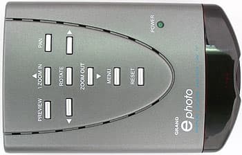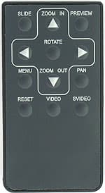 Кнопки для управления устройством расположены сверху. Они позволяют оперировать меню, а также управлять просмотром. Расположены на достаточно большом расстоянии друг от друга, легко различаются на ощупь — в общем, все продумано. Впрочем, просматривая фотографии удобнее сидеть на диване, нежели стоять рядом с телевизором, но и это учтено — в комплект входит небольшой пульт ДУ, похожий на прилагающийся к некоторым видеоплеерам. Он очень маленький, так что захватить его с собой в поездку труда не составит, а кнопок даже больше, чем на самом устройстве. Одна из трех дополнительных позволяет включать и отключать слайд-шоу без входа в меню, а две других выбирают, куда должен идти видеосигнал: на обычный выход или S-Video.
