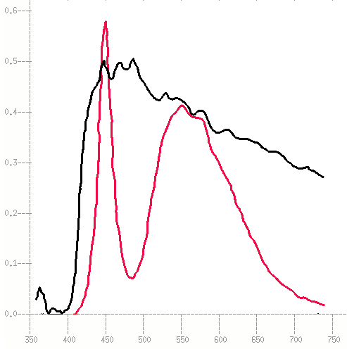 Красный график — спектр светодиодов подсветки HTC, черный — вспышки камеры Minox