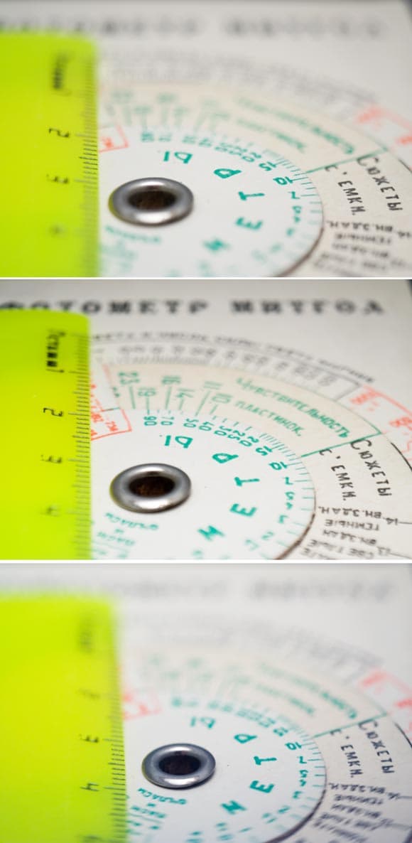 3) открытая диафрагма, наклон для получения минимальной глубины резкости.