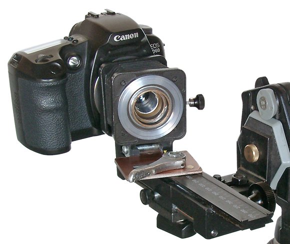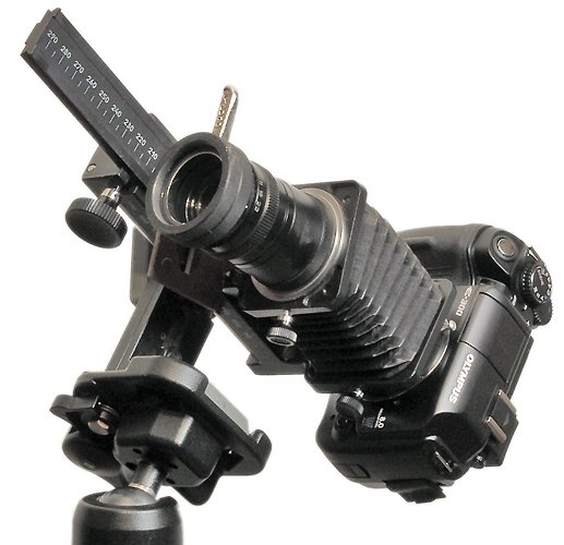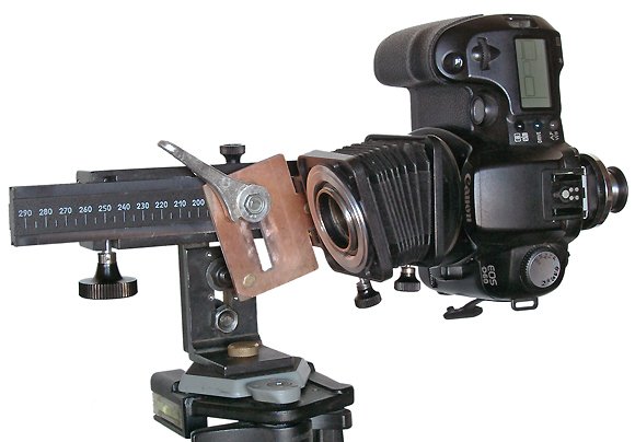 При использовании объектива Индустар 100У с фокусным расстоянием 110 мм мы получаем возможность растяжением мехов фокусироваться на объекты от бесконечности до 47 см от плоскости матрицы. Размер объекта занимающего полный кадр при этом составляет 45 мм, т. е. масштаб съемки будет 1:2. Съемка в большем масштабе легко достигается вкручиванием дополнительных удлинительных колец между аппаратом и мехами. Отмечу, что при макросъемке для фокусировки часто удобнее перемещать не объектив, а всю камеру на специальных салазках. Меха ПЗФ имеют встроенные салазки, однако они не очень удобны, поскольку не имеют системы плавного перемещения и снабжены только фиксатором мехов на рельсах. Я предпочитаю использовать переделанные салазки от мехов фирмы Pentacon, снабженные кремальерой.