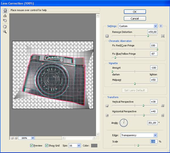 Интерфейс программы Lens Correction. Для демонстрации ее возможностей дефекты не устранялись, а наоборот утрированно усиливались.
