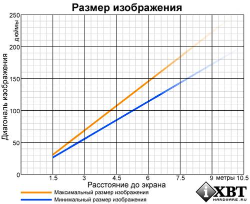 Рекомендуемое расстояние до экрана составляет от 1,5 до 5 метров. Яркости при этом хватает, чтобы увидеть картинку в незатемненном, но и не слишком светлом, конечно, помещении. При дальнейшем увеличении расстояния внешнее освещение скорее всего придется выключить, а шторы или жалюзи — закрыть. Ниже на графике показана зависимость минимального и максимального размера диагонали получаемого изображения в зависимости от расстояния от проектора до экрана.