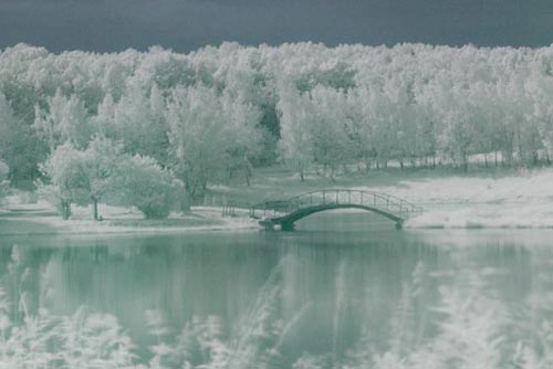 При фотосъемке в ИК и УФ диапазоне есть две «трудности», в которых эксплуатационные особенности «цифры» оказываются очень полезными. Эти трудности — определение экспозиции и наводка на фокус. Так как «на глаз» не то ни другое в случае «невидимого» света не настроишь, то приходится делать несколько дублей и по снимку на дисплее уже вводить необходимые коррективы. Определить экспозицию проще, чем правильный фокус. Ведь фокус для «зеленых » видимых лучей и ИК или УФ не совпадают (поэтому в хороших современных объективах эти невидимые глазу, но видимые пленкой лучи стараются полностью отрезать, чтобы они не уменьшали видимую на отпечатке резкость и контраст). Приходится устанавливать дистанцию на глаз и диафрагмировать объектив. Компактные цифровые камеры типа Canon G2, обладая маленькой матрицей и большей относительной глубиной резкости при той же диафрагме, удобней для первого метода (фокусировка на глаз). Но при выдержке в 10 секунд и чувствительности 400 картинка у них получается очень шумной. С зеркальной камерой придется сделать больше дублей, пробую различные дистанции фокусировки, но изображение будет более чистым.
