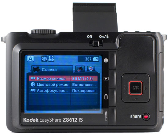 Там, где у других необычного дизайна автоматизированная крышка объектива, у Z8612IS простая с защелкой (и ушком для ремешка), которую мощный механизм объектива при включении без особых проблем «снимает» без вашего участия. Кнопка включения работает так, что включение камеры объединено с включением вспышки. С одной стороны, экономия на кнопках, с другой — всегда готовый к работе источник света. (Если при включении вспышку придержать рукой и не дать ей подняться, камера не включится.) Возможно, по меркам других — «не солидно». Ну и что? А электропитание! Можно использовать и АА элементы, и фирменный литиевый аккумулятор (KLIC-8000, в комплект не входит) и CRV3 батарею. И безо всяких переходников. Там, где другие добавляют к литиевому источнику «ум» или дополнительный выступ на корпусе, чтобы не допустить использование сторонних изделий, здесь полный универсализм. А простое меню! Освоить камеру можно без чтения инструкции. И при всем этом, не просто придумать, чего бы нельзя было с помощью камеры сделать фотографу-любителю.
