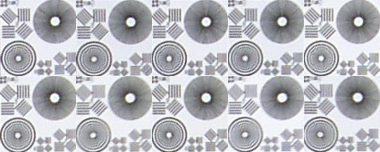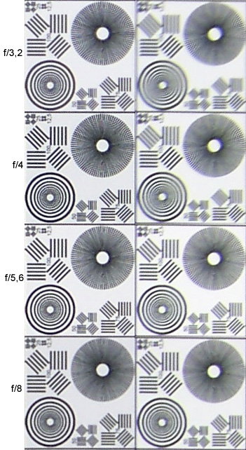 Далее приведены фрагменты снимков мишеней в масштабе 1:1 для центра (левая колонка) и края (правая колонка) кадра.