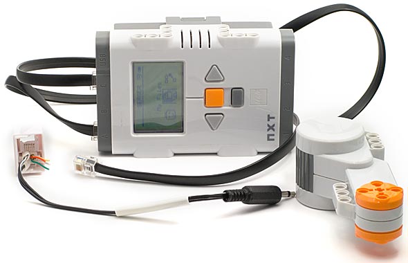 В стандартный комплект Lego Mindstorms NXT (элементы можно приобретать и по отдельности) входит набор «кубиков» Lego, системный блок с дисплеем, кнопочным управлением, USB-интерфейсом, портами для сервомашинок (3 порта) и сенсоров (4 порта), сервомашинки (3 штуки) и сенсоры (датчики касания, уровня освещения, звука, ультразвуковой дальномерный датчик), программное обеспечение. Так как конструктор предназначен для детей, то он прост и хорошо защищен.