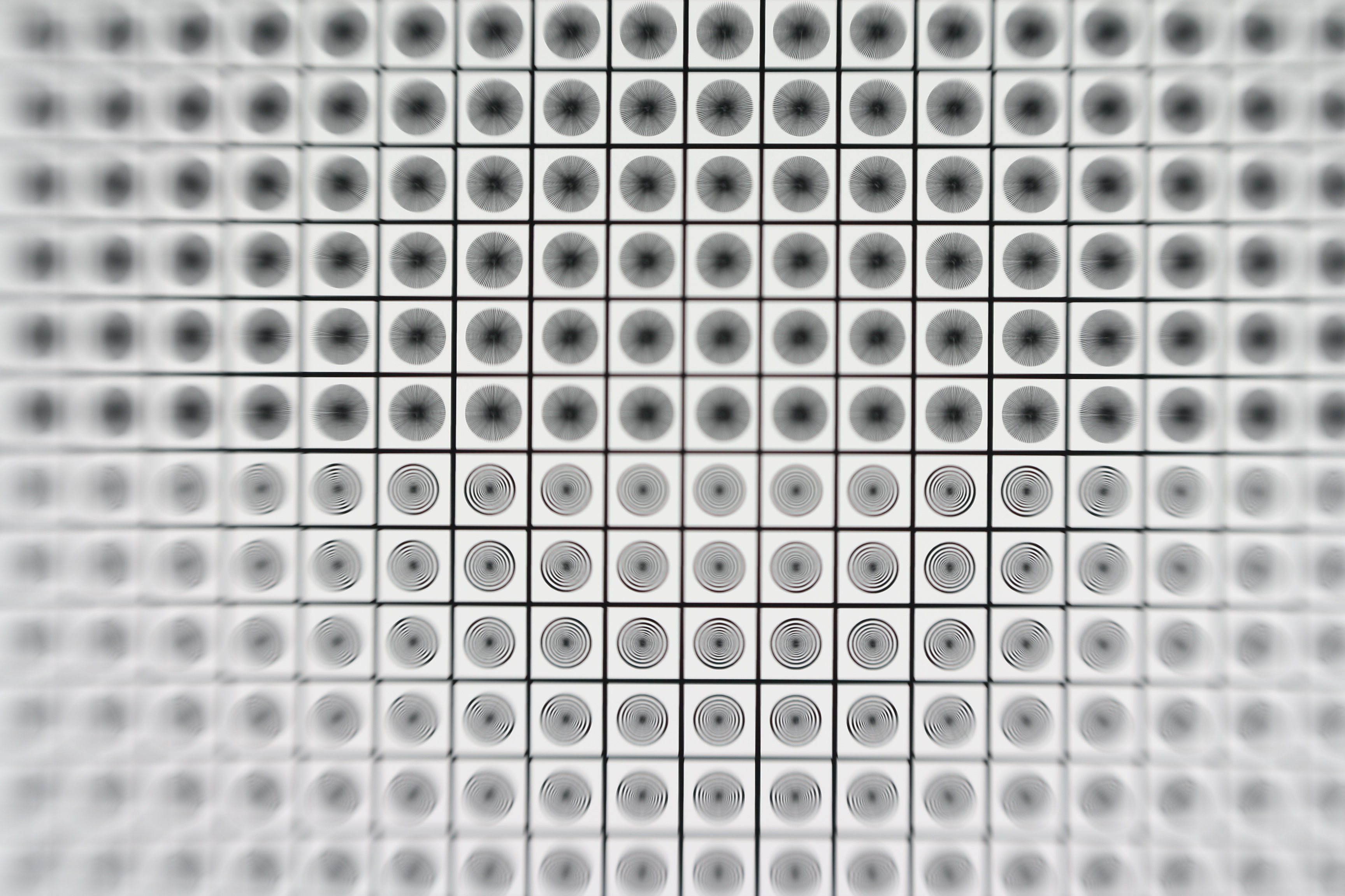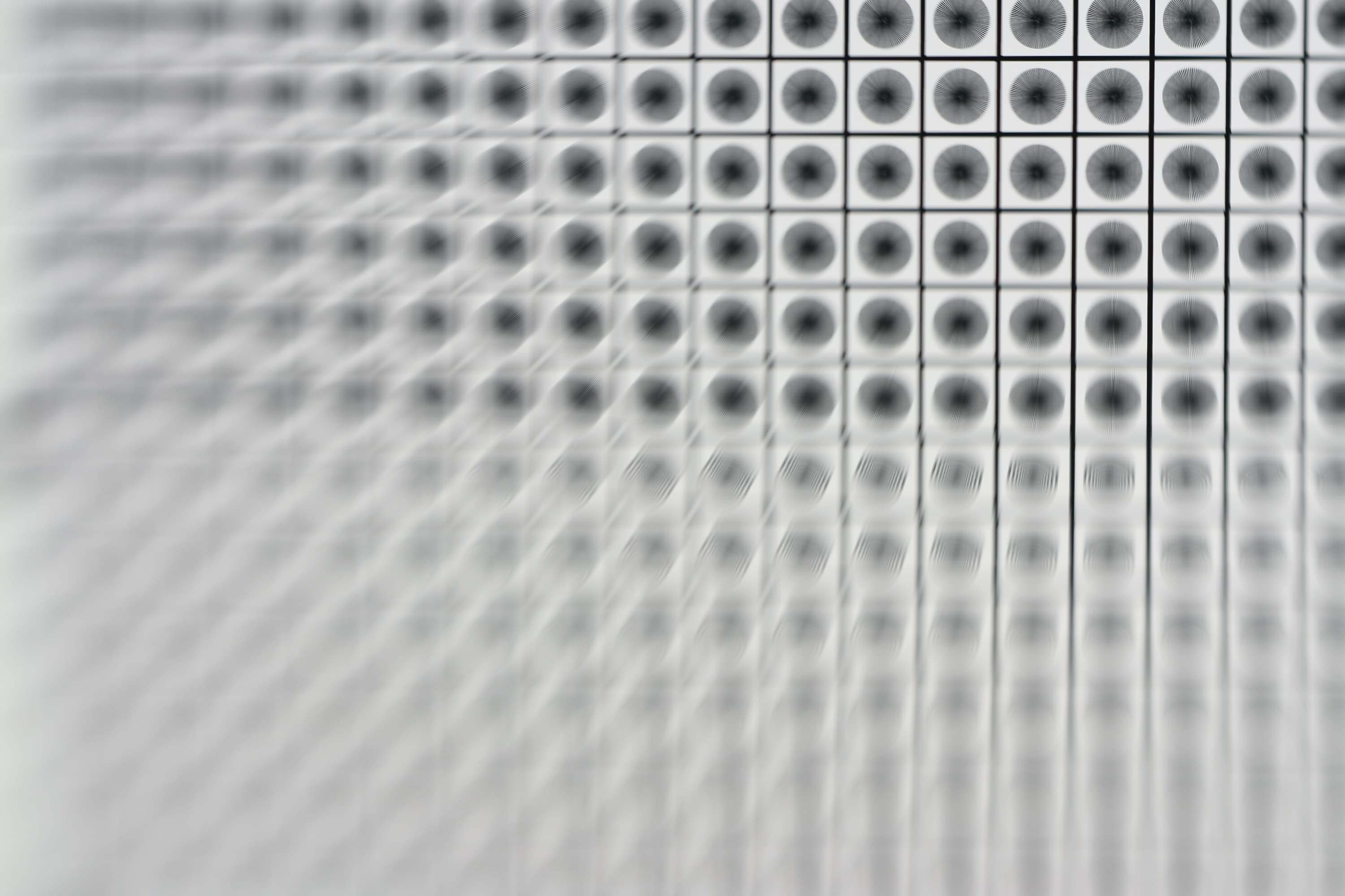 Оценить оптические качества Lensbaby G3 можно по снимкам миры. Съемка производилась с дистанции 1 метр. В Lensbaby G3 была установлена диафрагма f/4 круговой формы. Положение оптического блока с помощью трех винтов перемещения было подобрано так, чтобы при повороте кольца фокусировки до середины возможного диапазона настроек, мира приблизительно попадала бы в фокус. Далее выполнялась серия снимков миры с изменением фокусировки от удаленного плана до ближнего (соответствует порядку снимков — сверху вниз). К сожалению, точно настроить Lensbaby так, чтобы оптическая ось объектива была перпендикулярна плоскости матрицы, невозможно, поэтому изображения немного несимметричны относительно геометрического центра кадра.