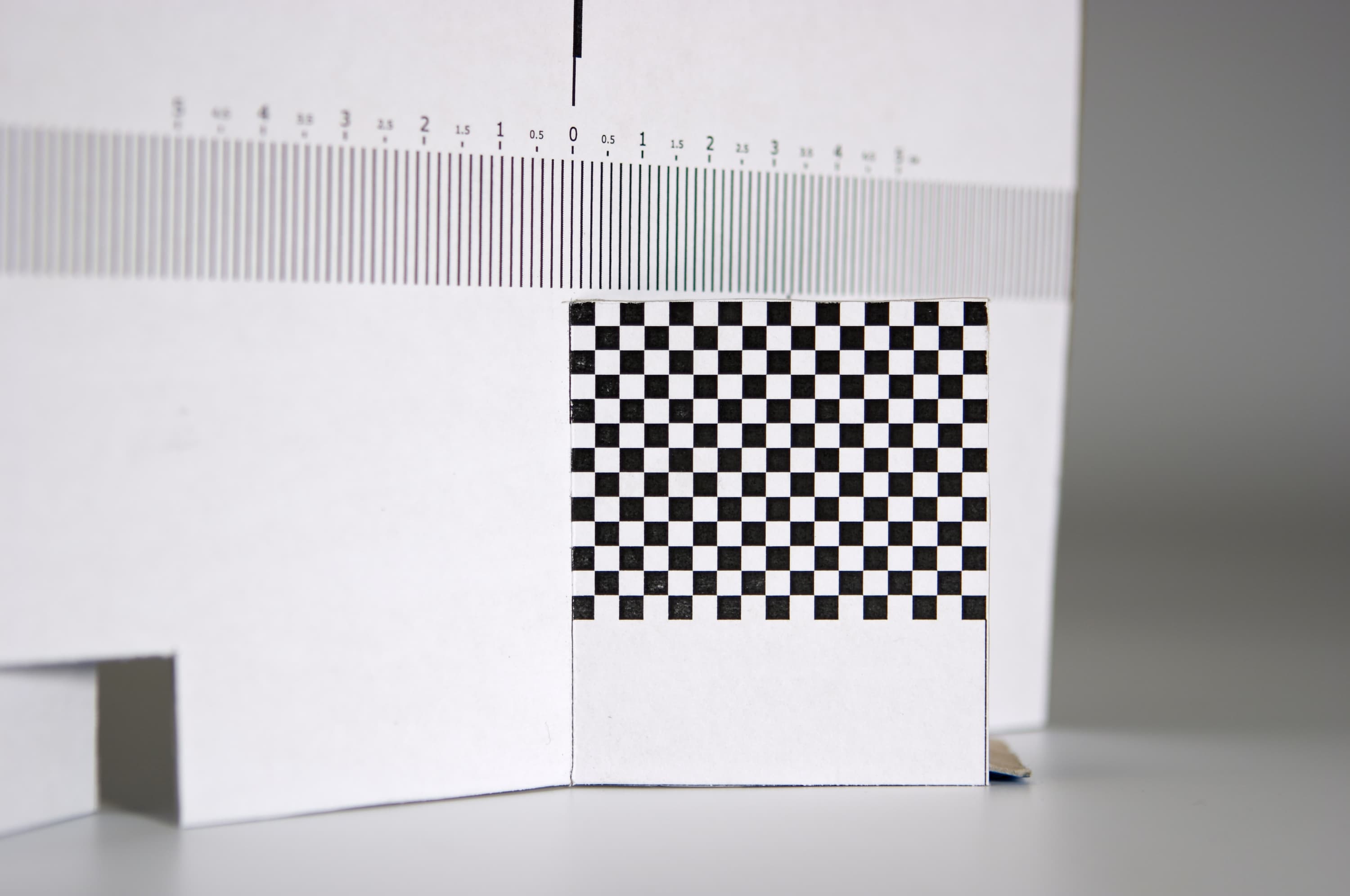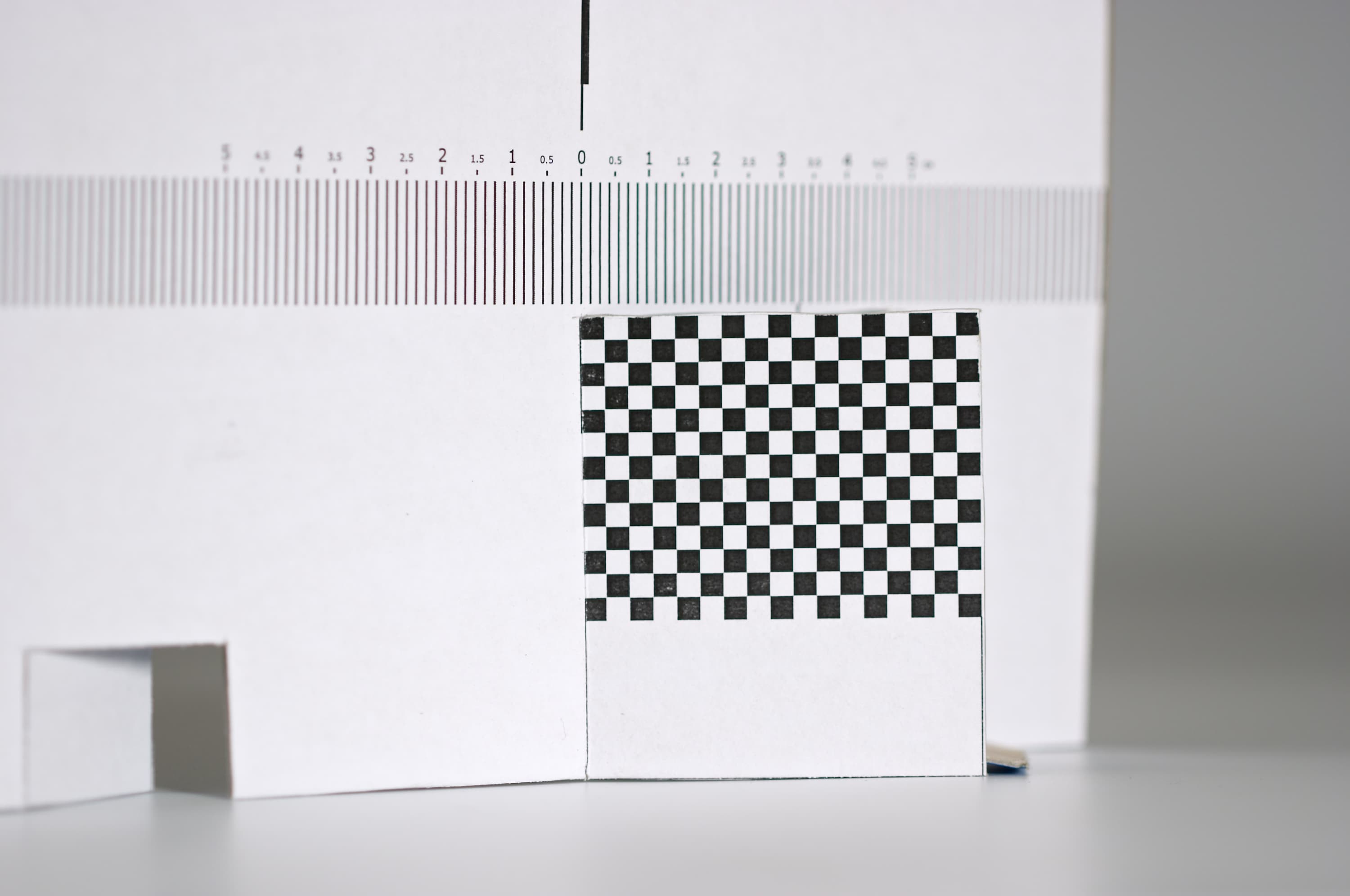 Для тестирования объектива на бэк-фокус используем специальную шкалу с мишенью. Ее несложно изготовить своими руками: распечатать на лазерном принтере, наклеить на плотный картон и сделать прорези для устойчивости. Скачать шкалу можно здесь (разрешение 300 dpi, размер 24×15 см).