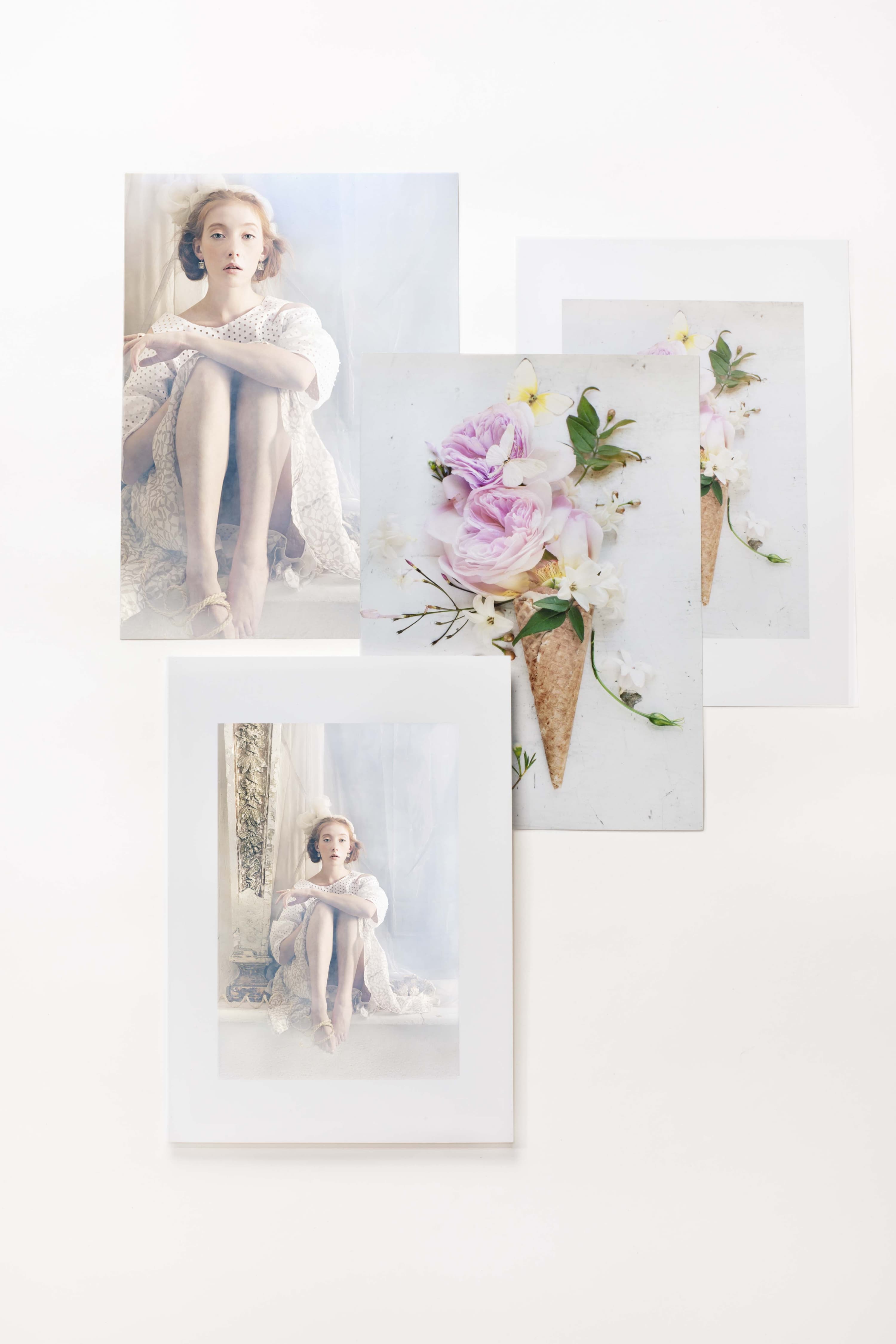 Для такой съемки сложно подобрать фотобумагу. Я пробовала печатать на матовой бумаге — получался слишком глухой цвет, без свечения; пробовала сатин — кадр получался излишне контрастным, пропадала легкость и воздушность. И так далее. В результате я придумала использовать бумагу из серии Fine Art Metallic, Semi Glossy (260 г/м²) — это фотобумага, обладающая металлическим блеском, полуглянец.