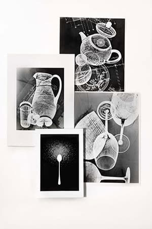 Вторая серия натюрмортов, которую я решила напечатать — это фотограммы. Как и в случае портретов из Большого театра, это работы, сделанные мной вручную. Фотограммa — это фотография без использования камеры: предметы кладутся на классическую фотобумагу и засвечиваются сверху фонариком. Получаются отпечатки и тени предметов на фотобумаге. Дальше эти отпечатки были отсканированы и отретушированы. Это выставочная серия, поэтому мне интересно было понять, какой тип бумаги лучше всего подойдет для таких работ. В них много черного и важна его насыщенность; они похожи на графику — поэтому мне хотелось подобрать такой тип бумаги, на котором фотограммы будут смотреться именно как графика и в меньшей степени как фотография.
