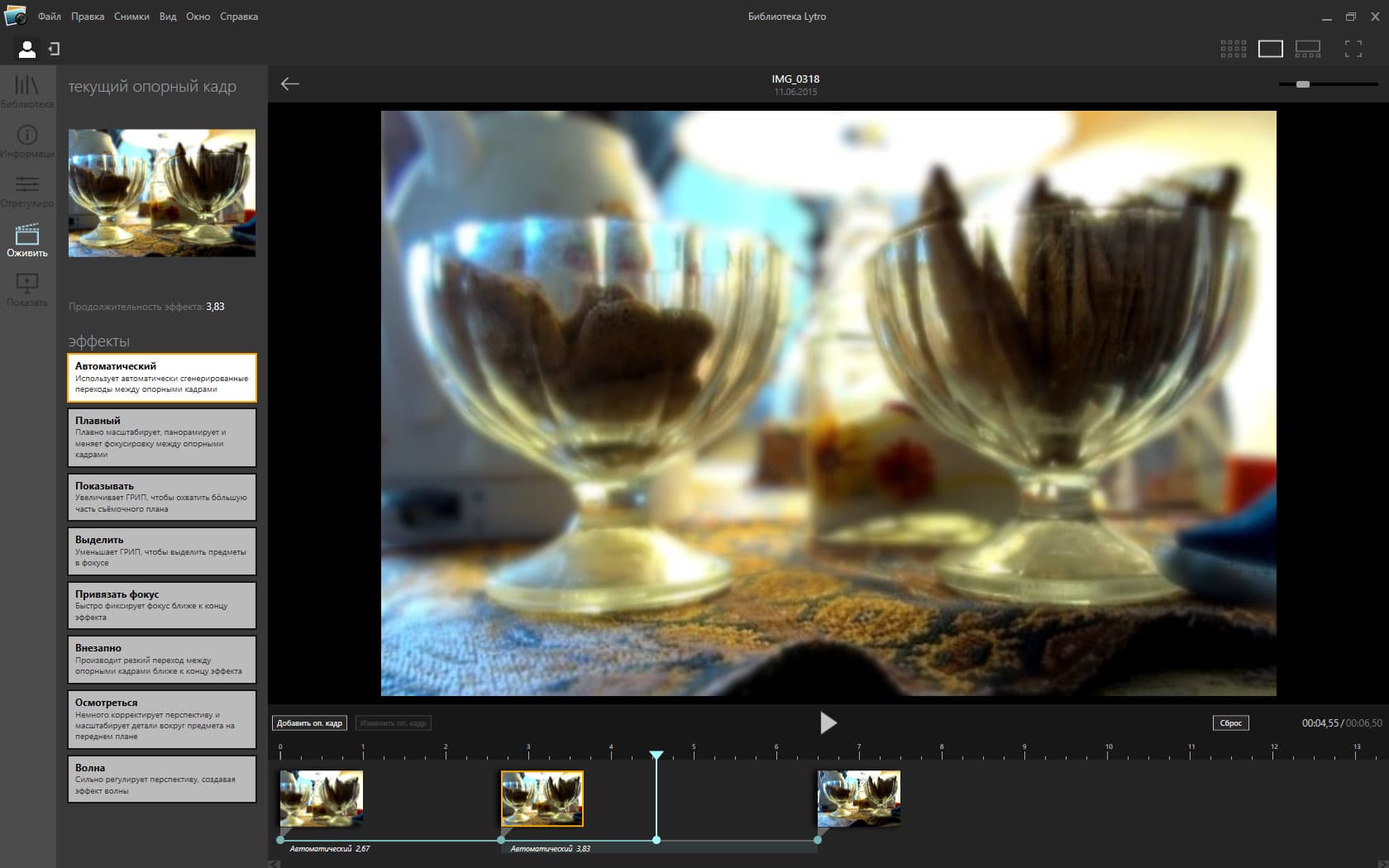 При создании видео можно менять количество и расположение опорных кадров и выбирать эффект имитации объемного кадра. Например, «Выделить» уменьшает ГРИП, чтобы объекты в фокусе четко выделялись на фоне объектов не в фокусе. Вариант «Осмотреться» корректирует перспективу и масштабирует детали вокруг объекта на переднем плане.