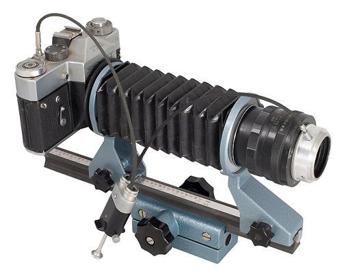 Так, на приведенных фотографиях меха фирмы PENTACON имеют салазки, позволяющие плавно перемещать аппарат с помощью кремальеры, меха же могут быть растянуты и зафиксированы, но не имеют устройства плавного и непрерывного изменения растяжения. Меха же ПЗФ, наоборот, имеют устройство плавного растяжения при вращении кремальеры и салазки в виде двух рельс и фиксирующего винта. То есть, в одном случае, вращая рукоятку, мы перемещаем камеру, масштаб же мы должны выбрать предварительно и зафиксировать. Во втором случае масштаб можно изменять, вращая рукоятку, а вот перемещение осуществляется просто сдвигом камеры рукой по направляющим с последующей ее фиксацией.