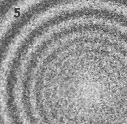 Для сравнения изображение, полученное цифровой камерой, уменьшено до совпадения масштабов. Ниже приведена центральная часть миры (начиная с пятого белого кольца), один к одному.