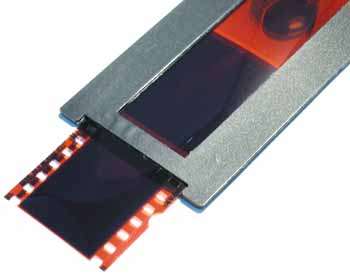 Пленка вставляется в прорезь держателя и кладется на стекло сканера. Это обеспечивает ее надежное выравнивание и «точное» положение, необходимое для «фокусировки». Материал, из которого сделан держатель, очень мягок и сам по себе не повредит поверхность пленки. Но в прорези для вставки пленки обязательно рано или поздно накопятся пылинки и будут портить слайды и негативы.