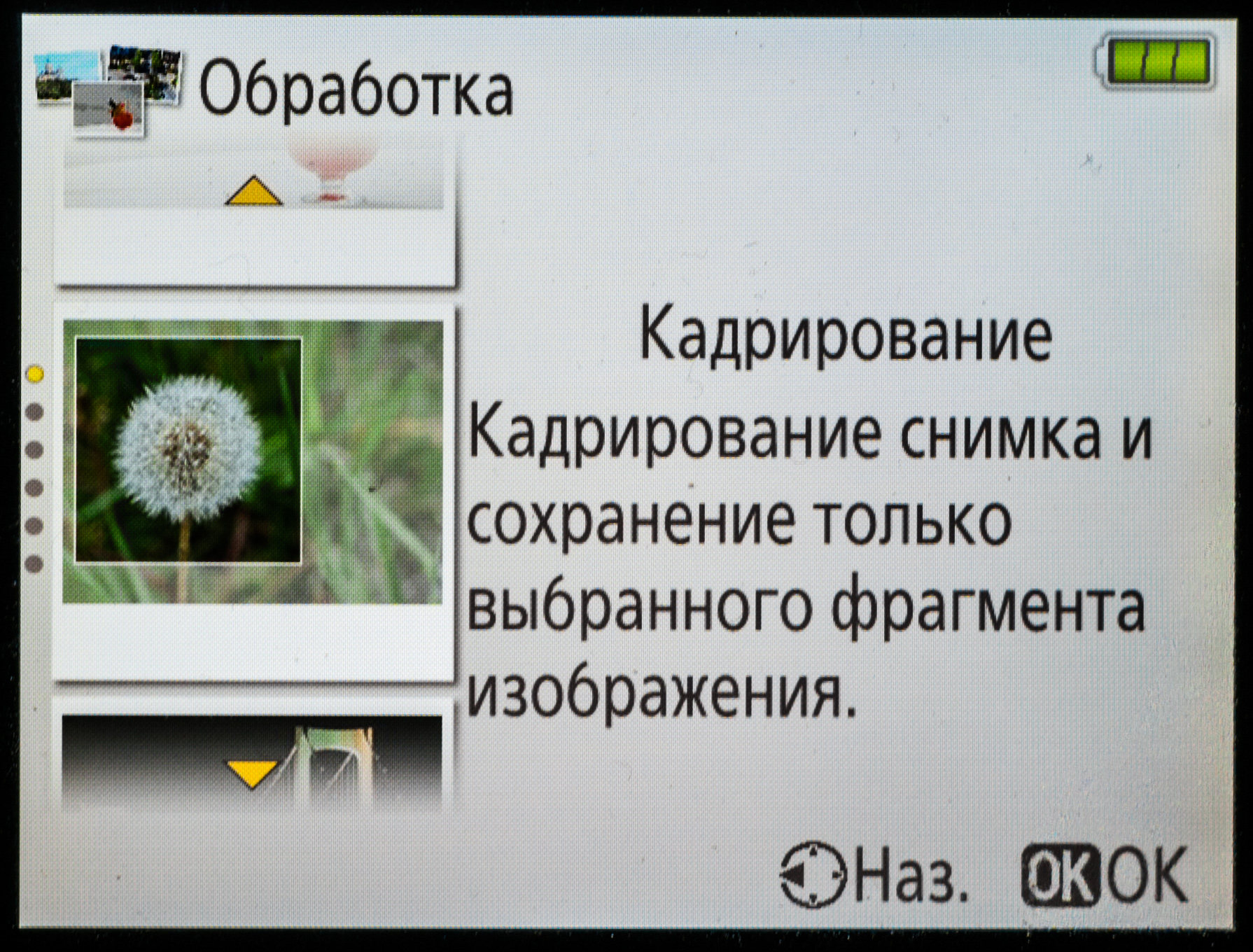 Как сказано выше, стандартное меню ЦЗК дополнено специальным расширением — режимом справки. Это своеобразный ассистент начинающего фотографа, помогающий выбрать правильные параметры съемки, особенно в ситуациях, когда сложность сцены не является очевидной. Справочник представлен четырьмя разделами: съемка, обработка, настройка, просмотр/удаление. Раздел «съемка», в свою очередь, имеет два подраздела (простая эксплуатация и расширенные функции), а раздел «обработка» содержит несколько программных алгоритмов, или фильтров, позволяющих изменять окончательное представление снимков.