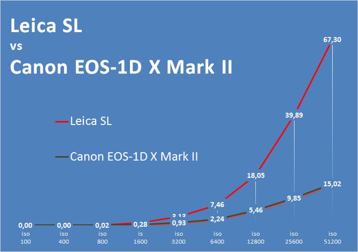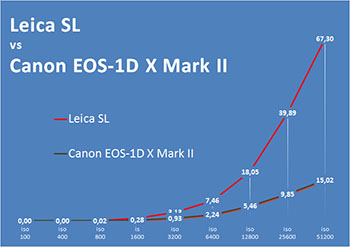 | Уровень шумов | Nikon D5 | Canon EOS-1D X Mark II | Leica SL (Typ 601) | Nikon D750 |